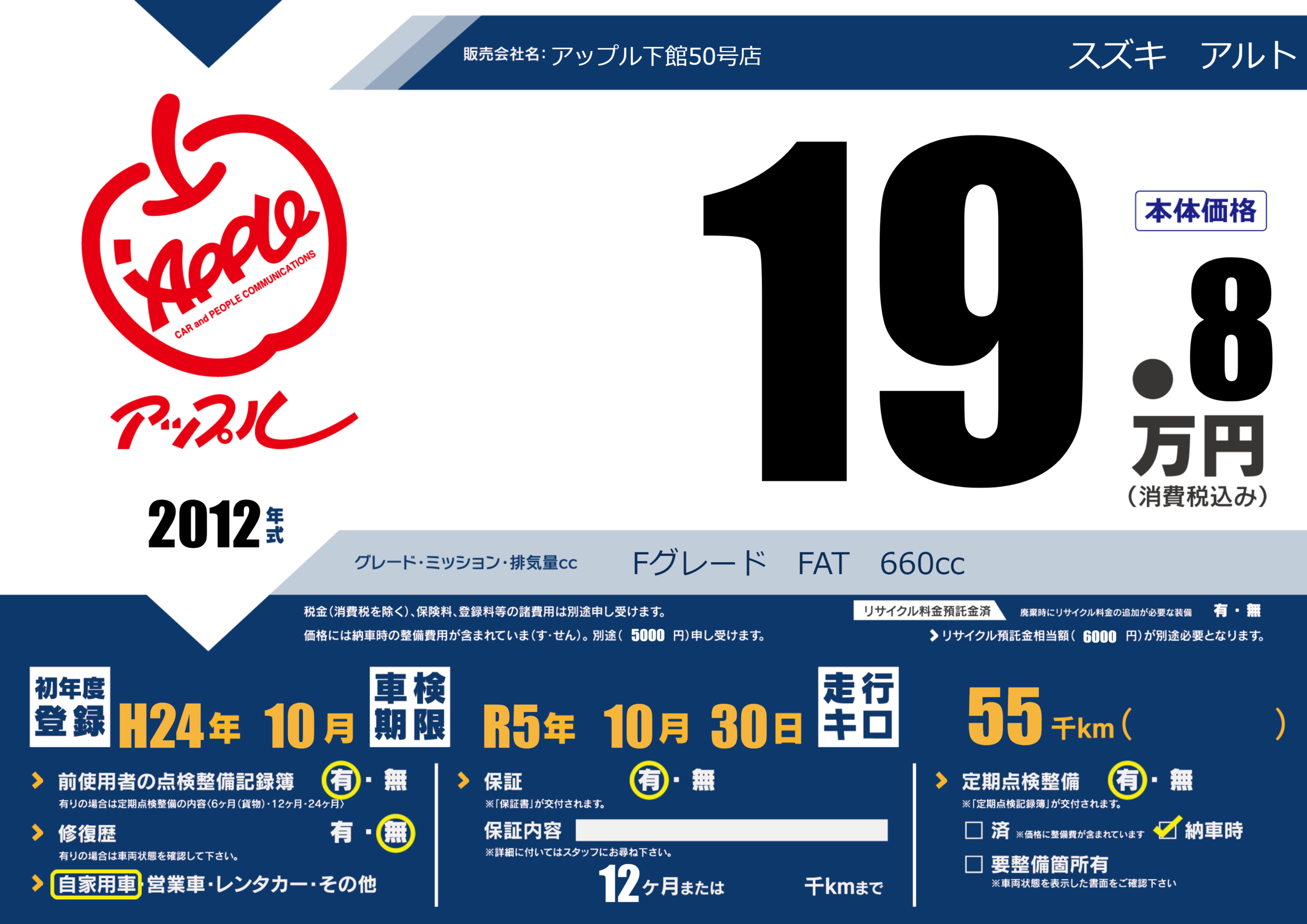 | 車名 | スズキ アルト | グレード ミッション 排気量 |