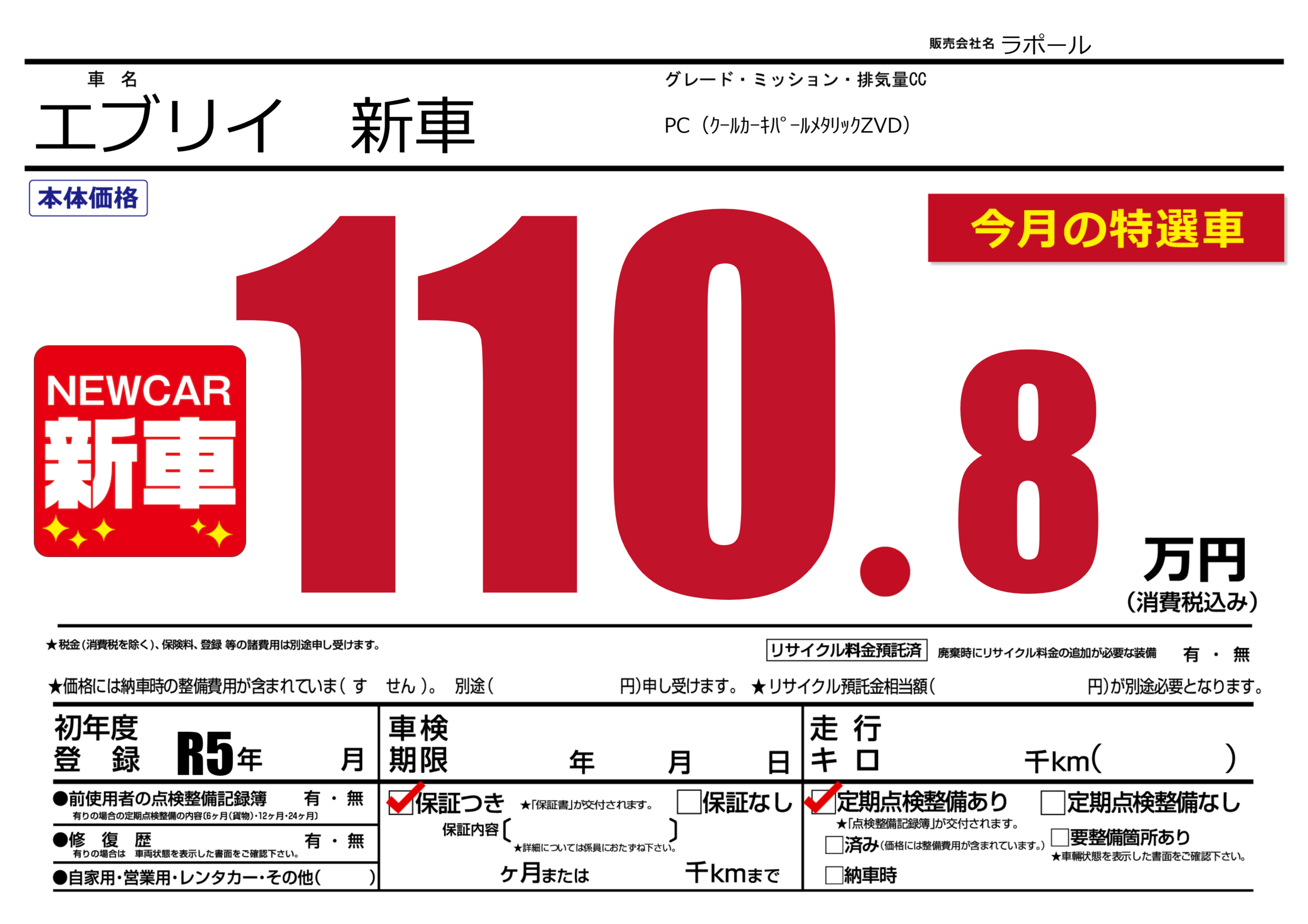 | 車名 | エブリイ 新車 | グレード ミッション 排気量 |