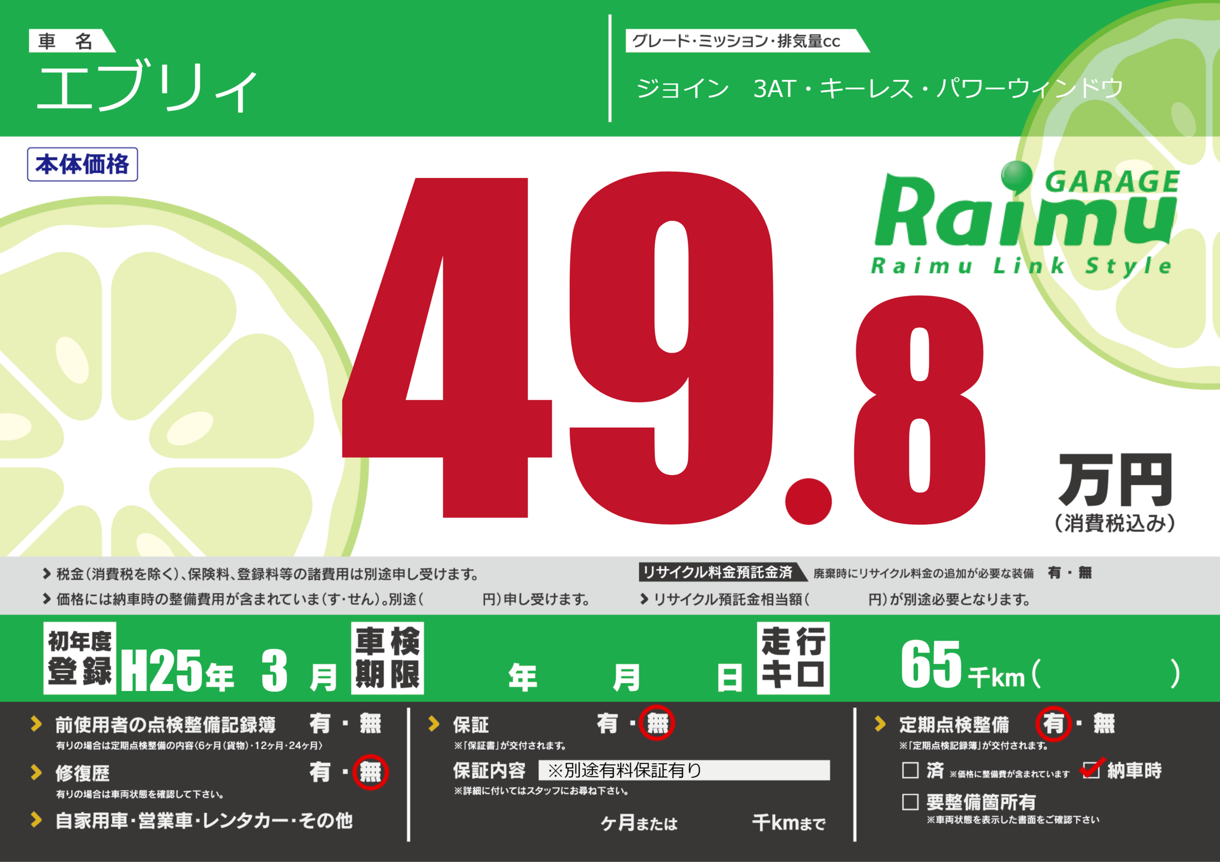 | 定期点検整備 | 定期点検整備あり 納車時あり | ||