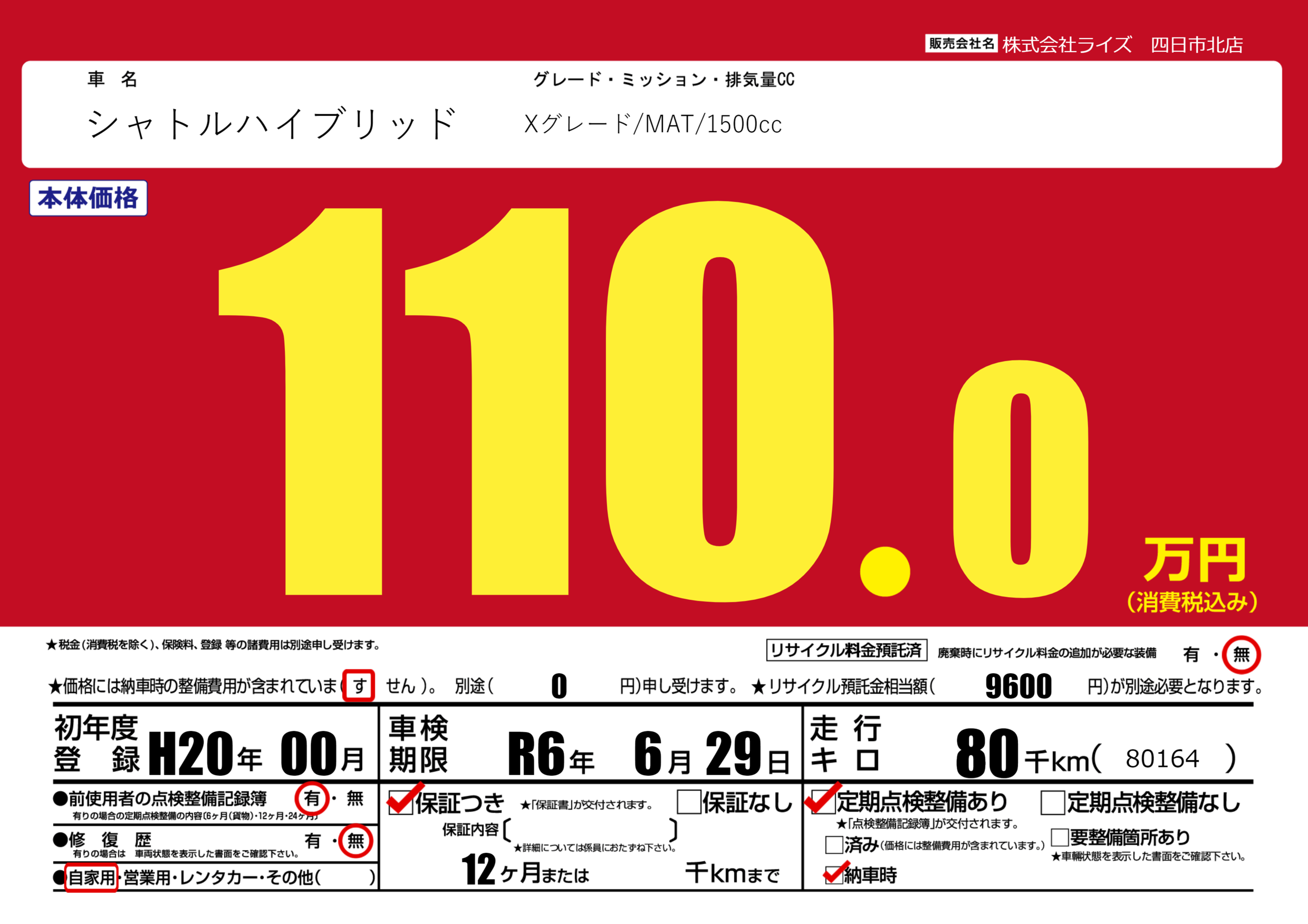| 車名 | シャトルハイブリッド | グレード ミッション 排気量 |