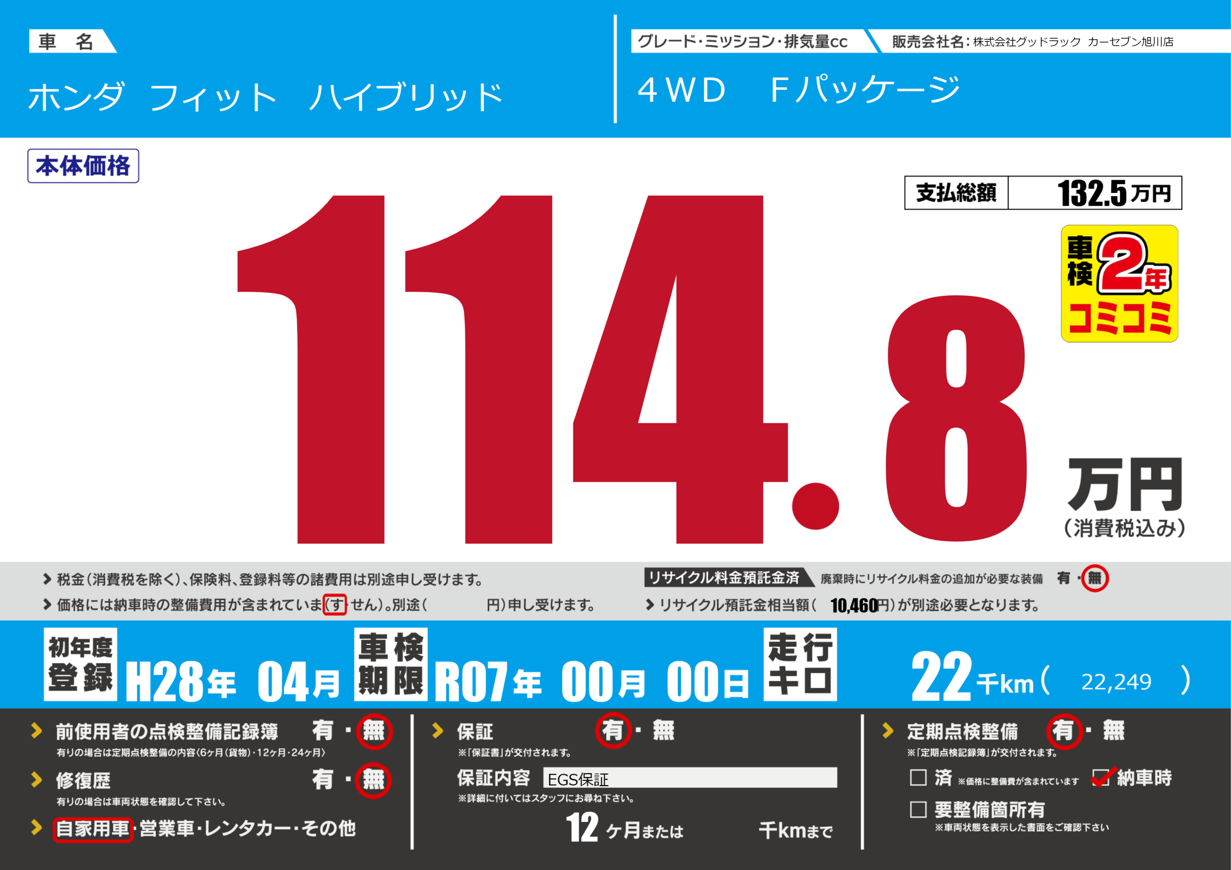 | 車名 | ホンダ フィット ハイブリッド | グレード ミッション 排気量 |
