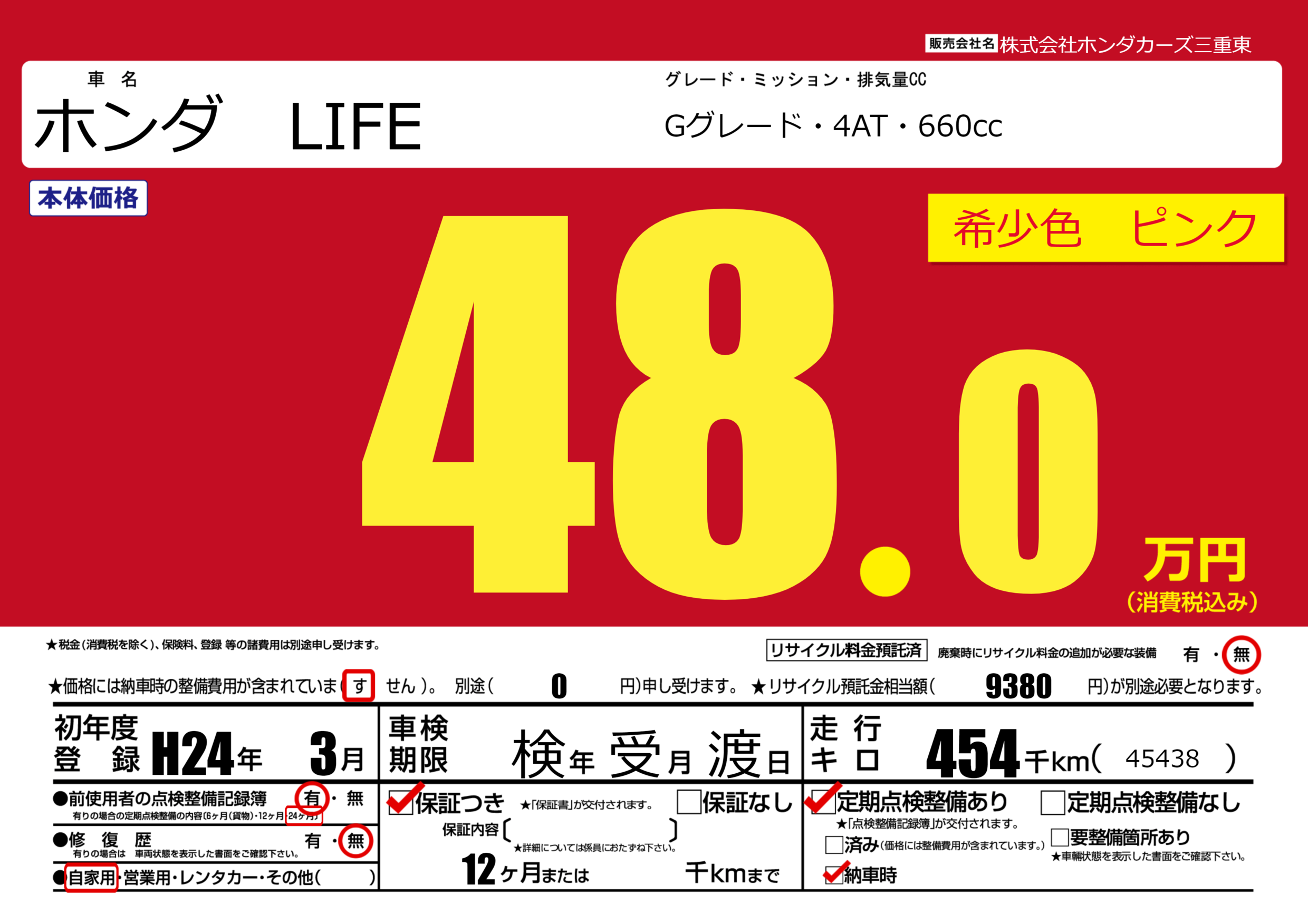 | 車名 | ホンダ LIFE | グレード ミッション 排気量 |