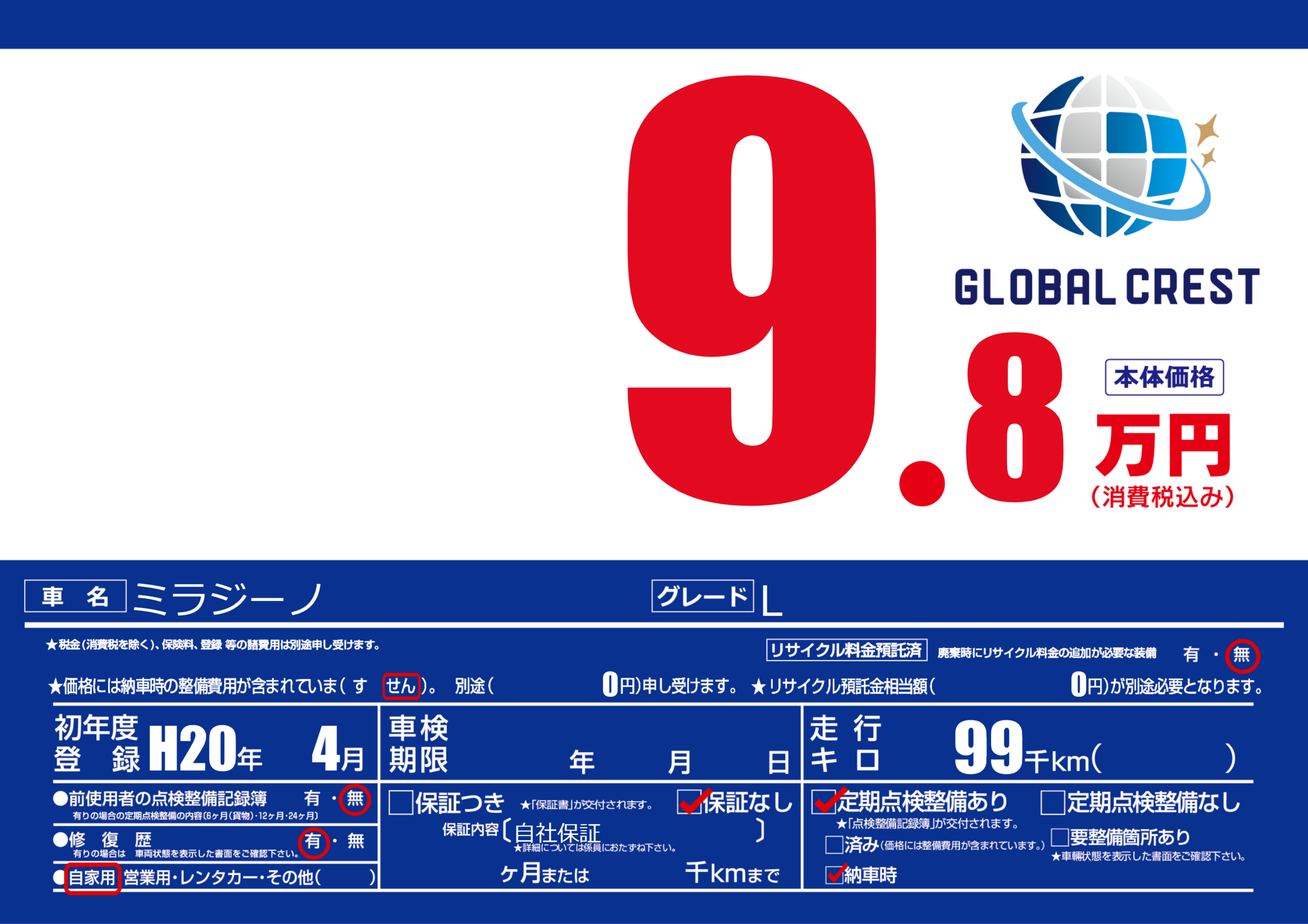 | 車名 | ミラジーノ | グレード ミッション 排気量 |