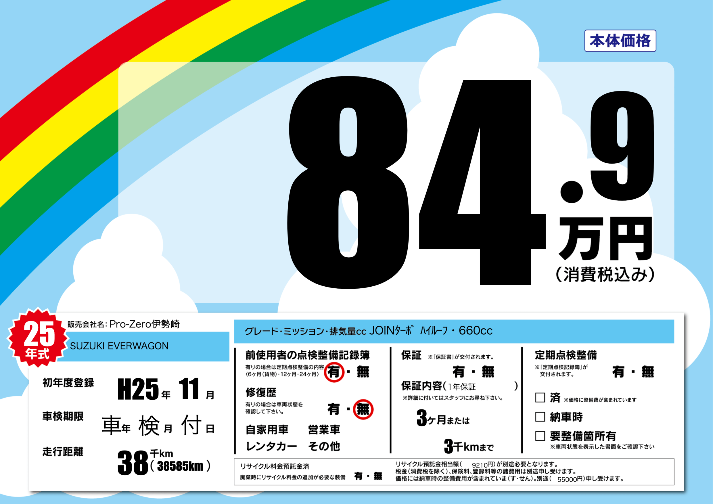 | 車名 | SUZUKI EVERWAGON | グレード ミッション 排気量 |