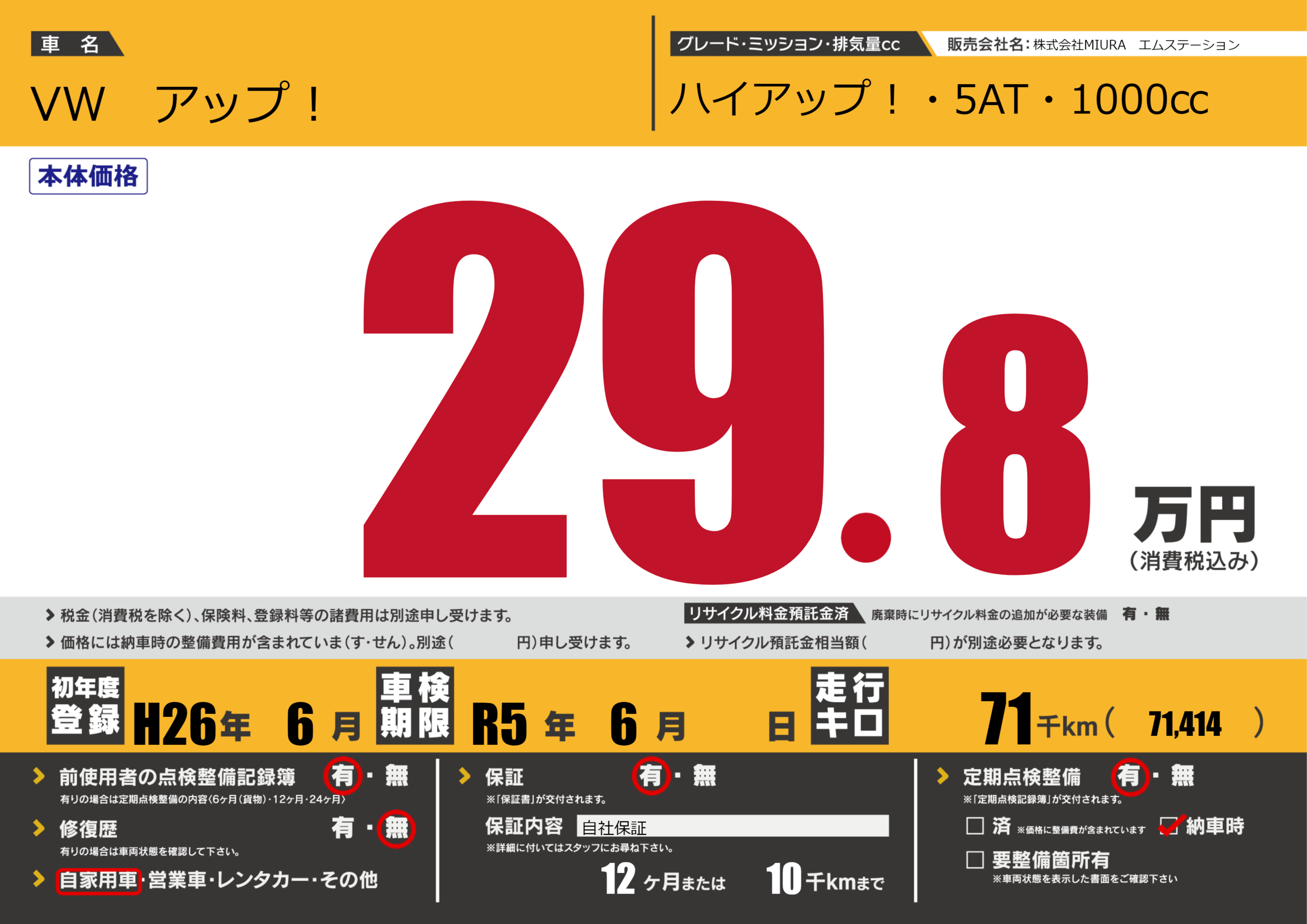 保証付き 保証内容(自社保証) 12ヶ月または(10)千kmまで |