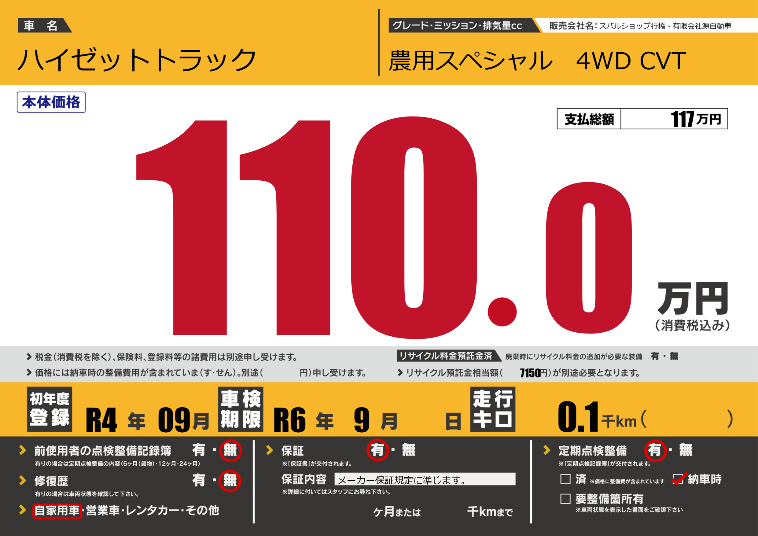保証付き 保証内容(メーカー保証規定に準じます。) ---ヶ月または()千kmまで |