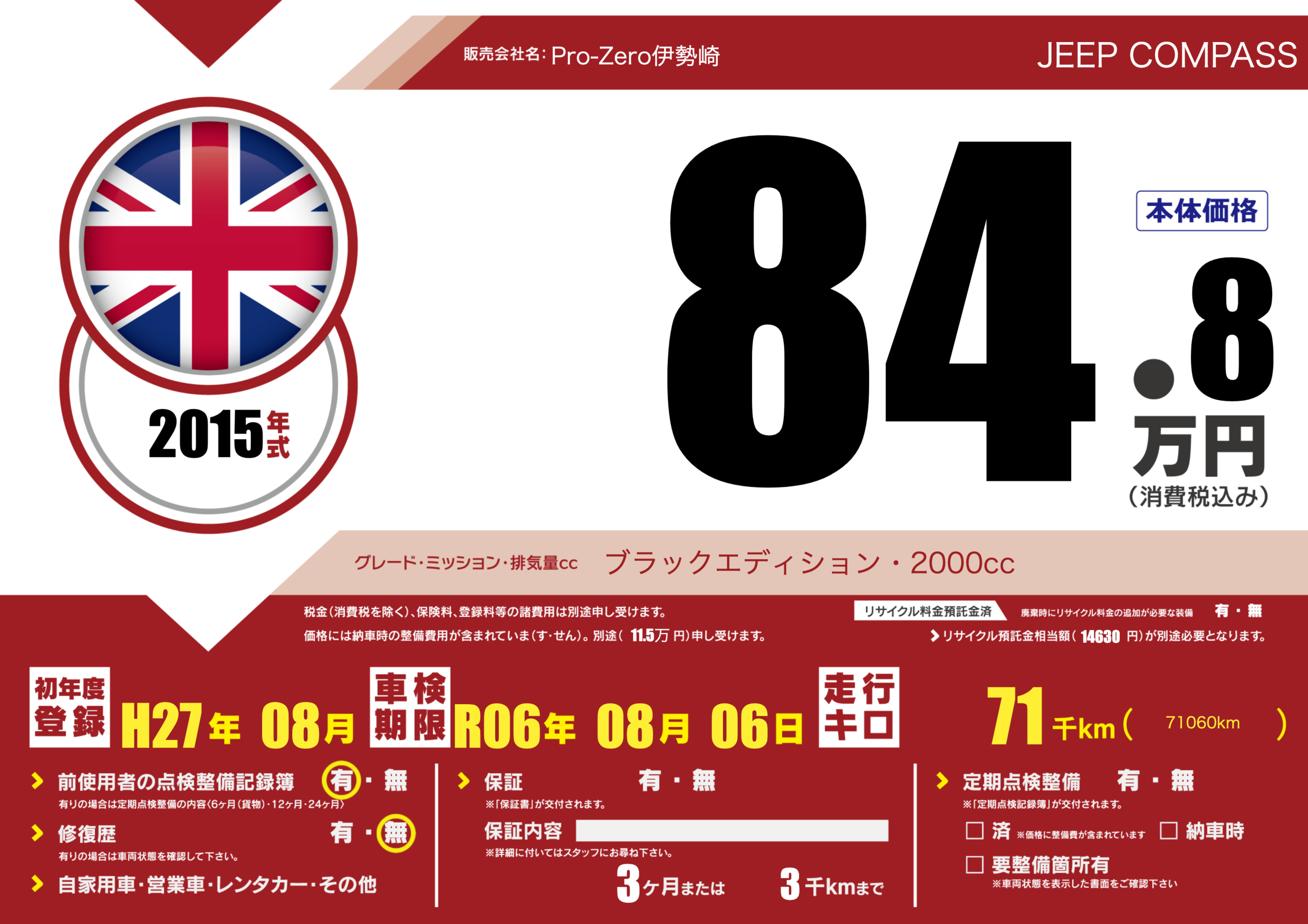 | 車名 | JEEP COMPASS | グレード ミッション 排気量 |