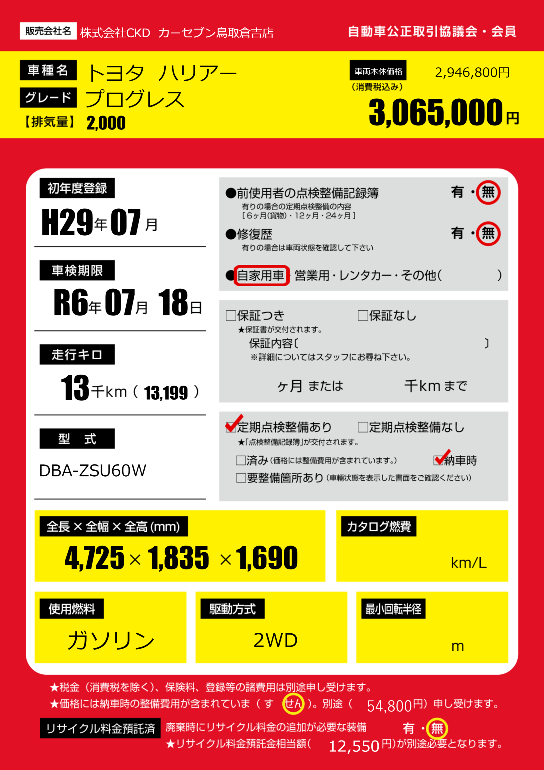 | 車名 | トヨタ ハリアー | グレード ミッション 排気量 |