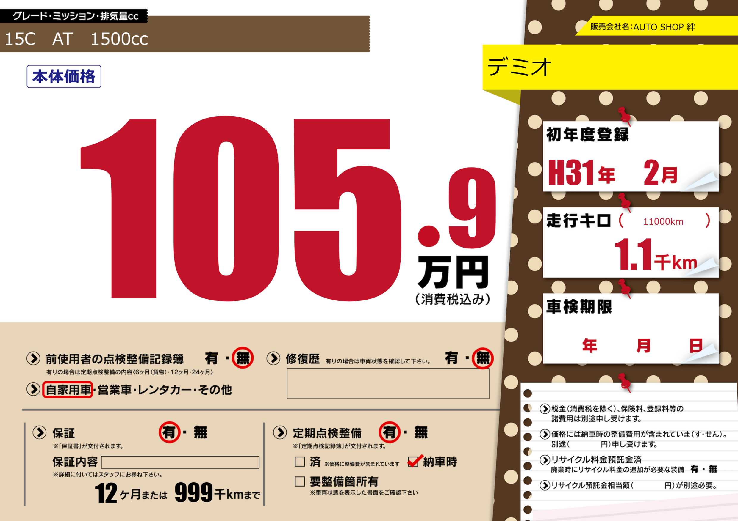 保証付き 保証内容(---) 12ヶ月または(999)千kmまで |