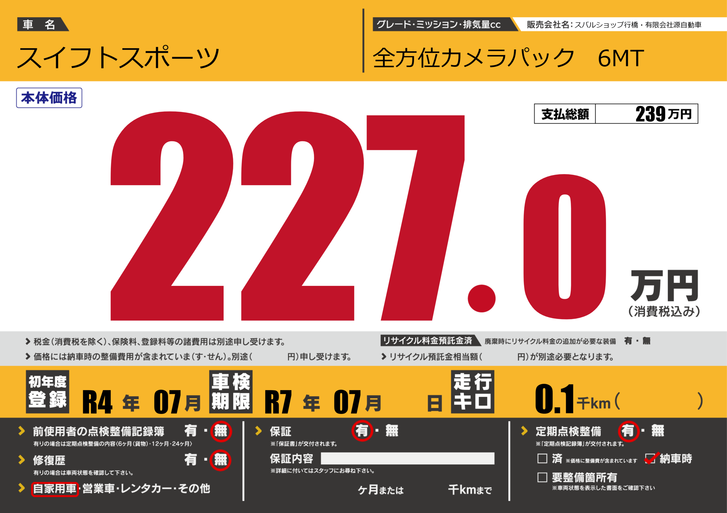 | 車名 | スイフトスポーツ | グレード ミッション 排気量 |