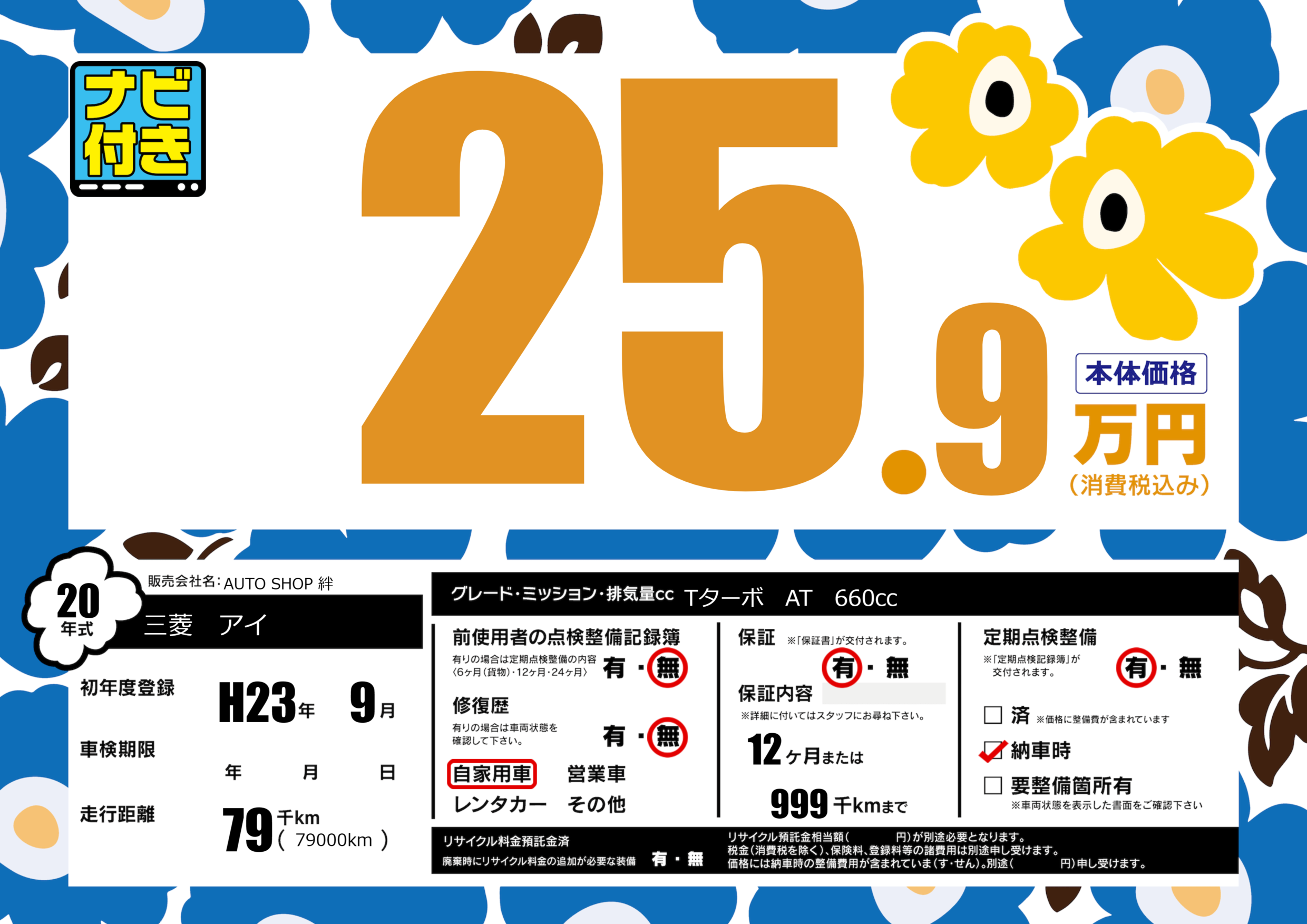 | 車名 | 三菱 アイ | グレード ミッション 排気量 |