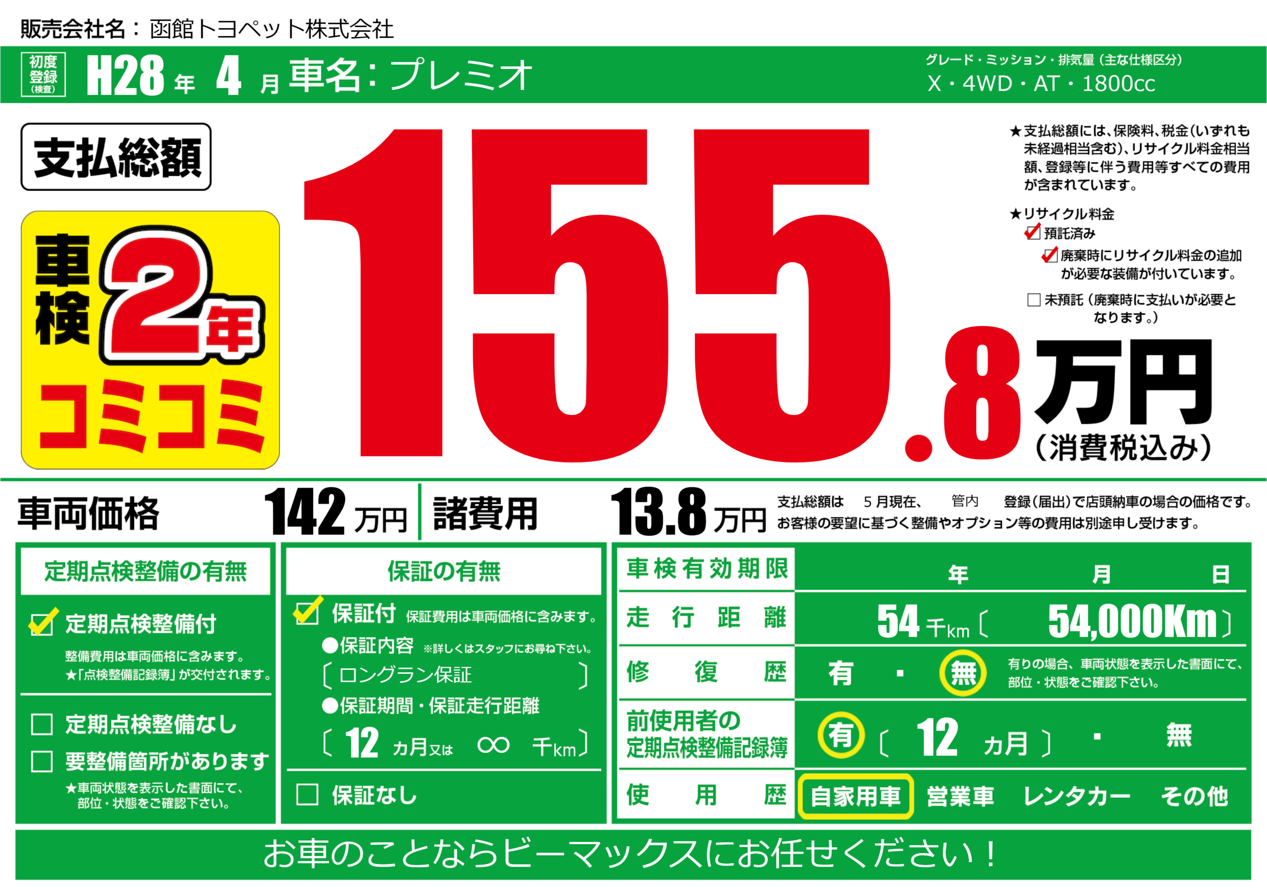 | 車名 | プレミオ | グレード ミッション 排気量 |