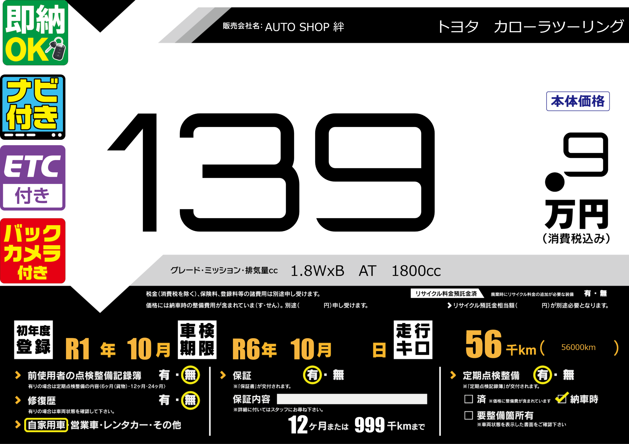| 車名 | トヨタ カローラツーリング | グレード ミッション 排気量 |