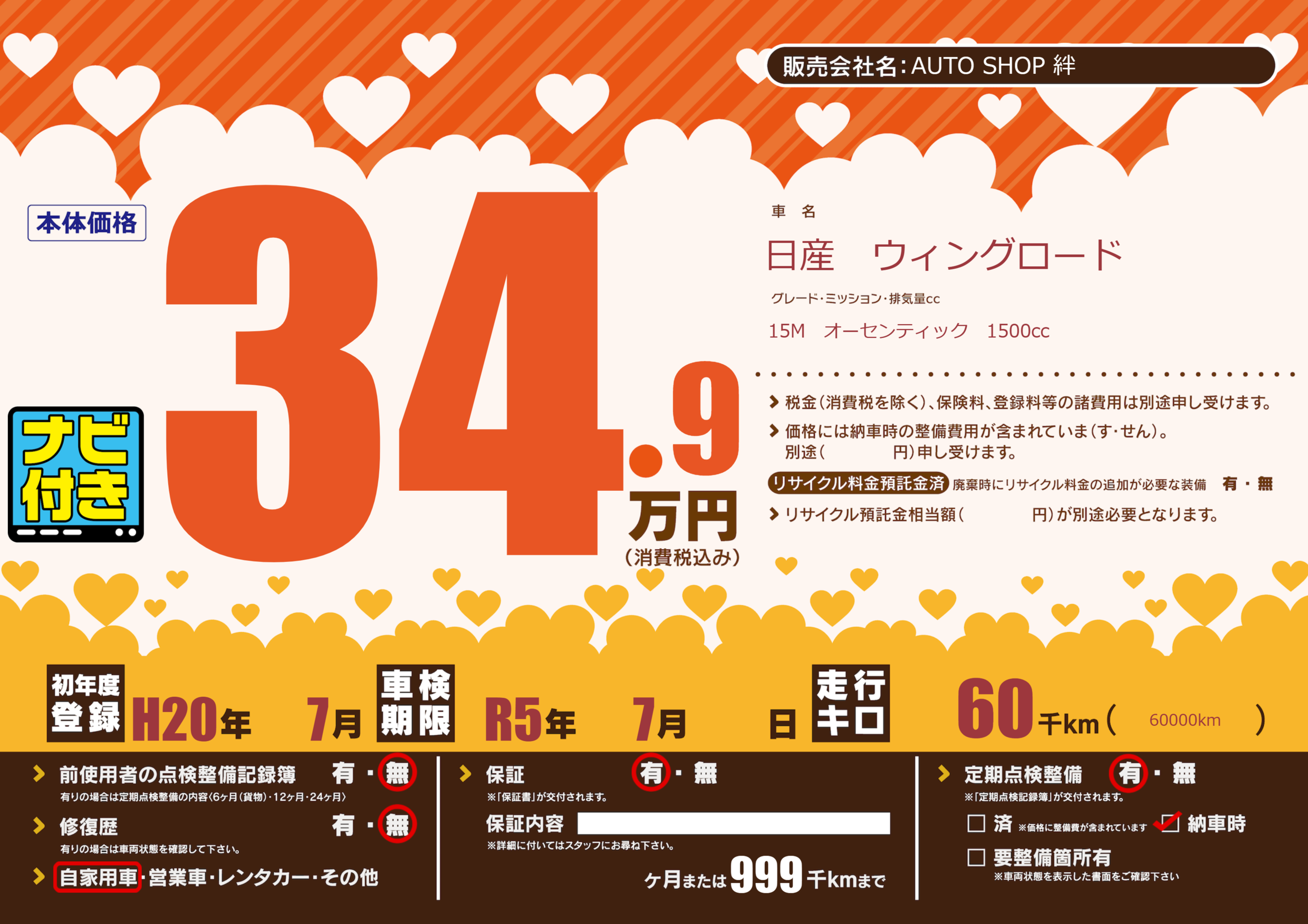 | 車名 | 日産 ウィングロード | グレード ミッション 排気量 |