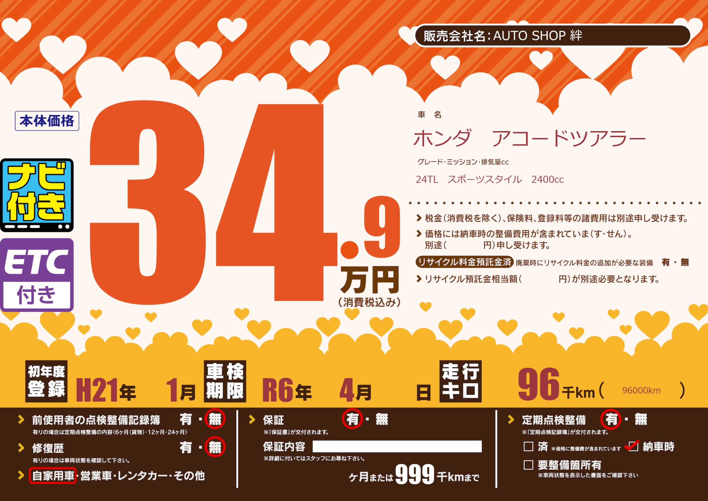 | 車名 | ホンダ アコードツアラー | グレード ミッション 排気量 |