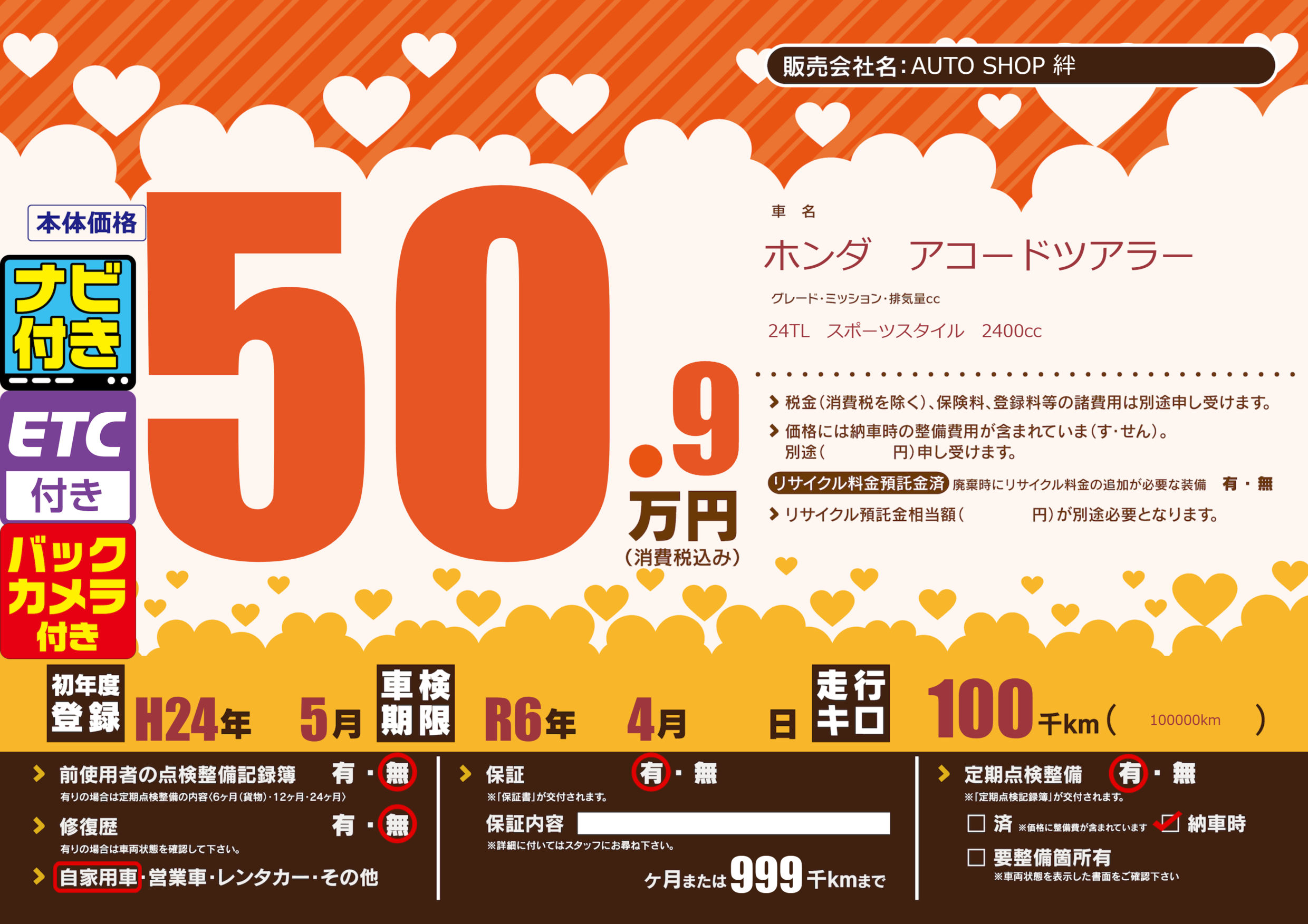 | 走行キロ | 10万km | 初年度登録 | H24年5月 |