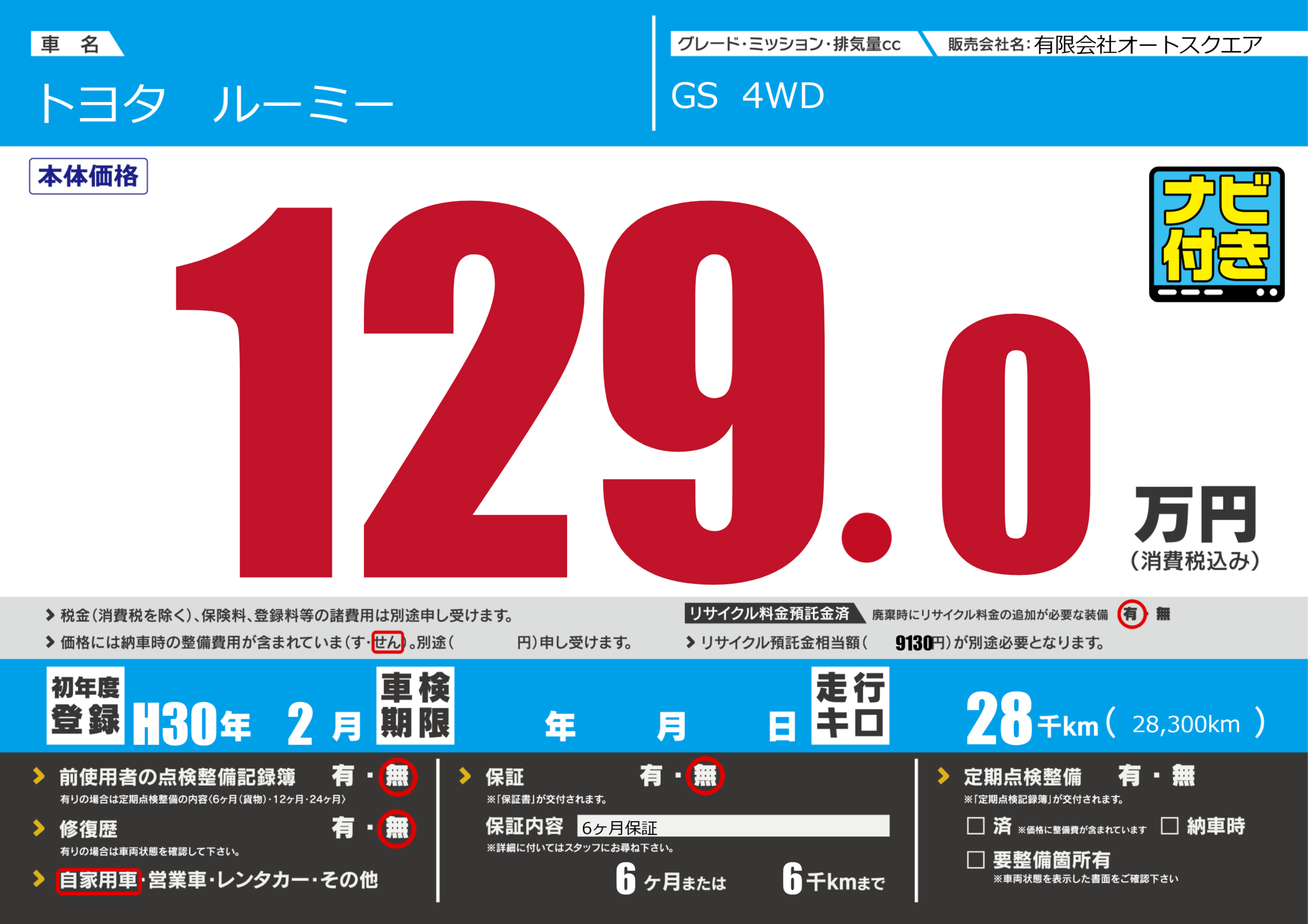 | 車名 | トヨタ ルーミー | グレード ミッション 排気量 |