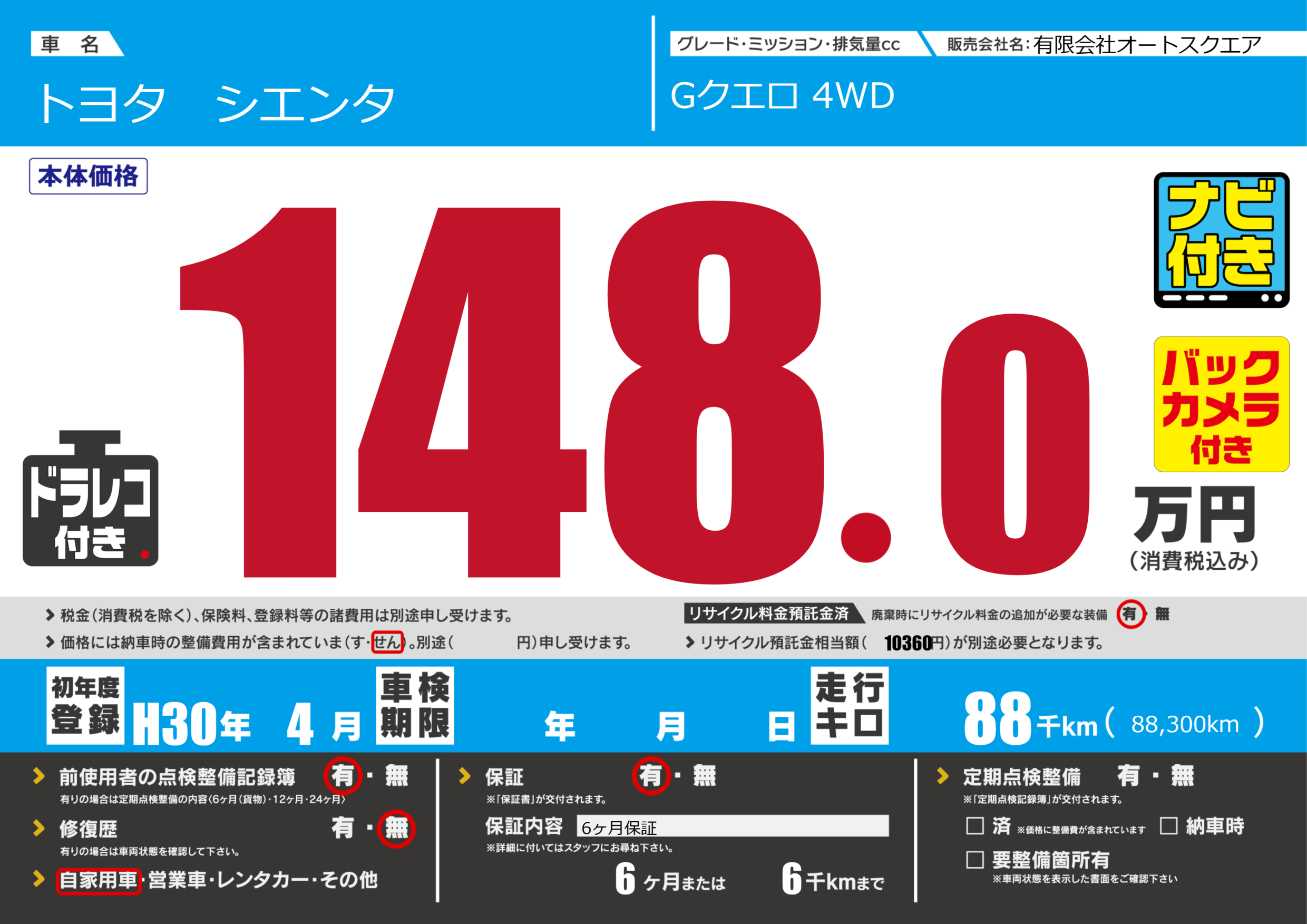 保証付き 保証内容(6ヶ月保証) 6ヶ月または(6)千kmまで |