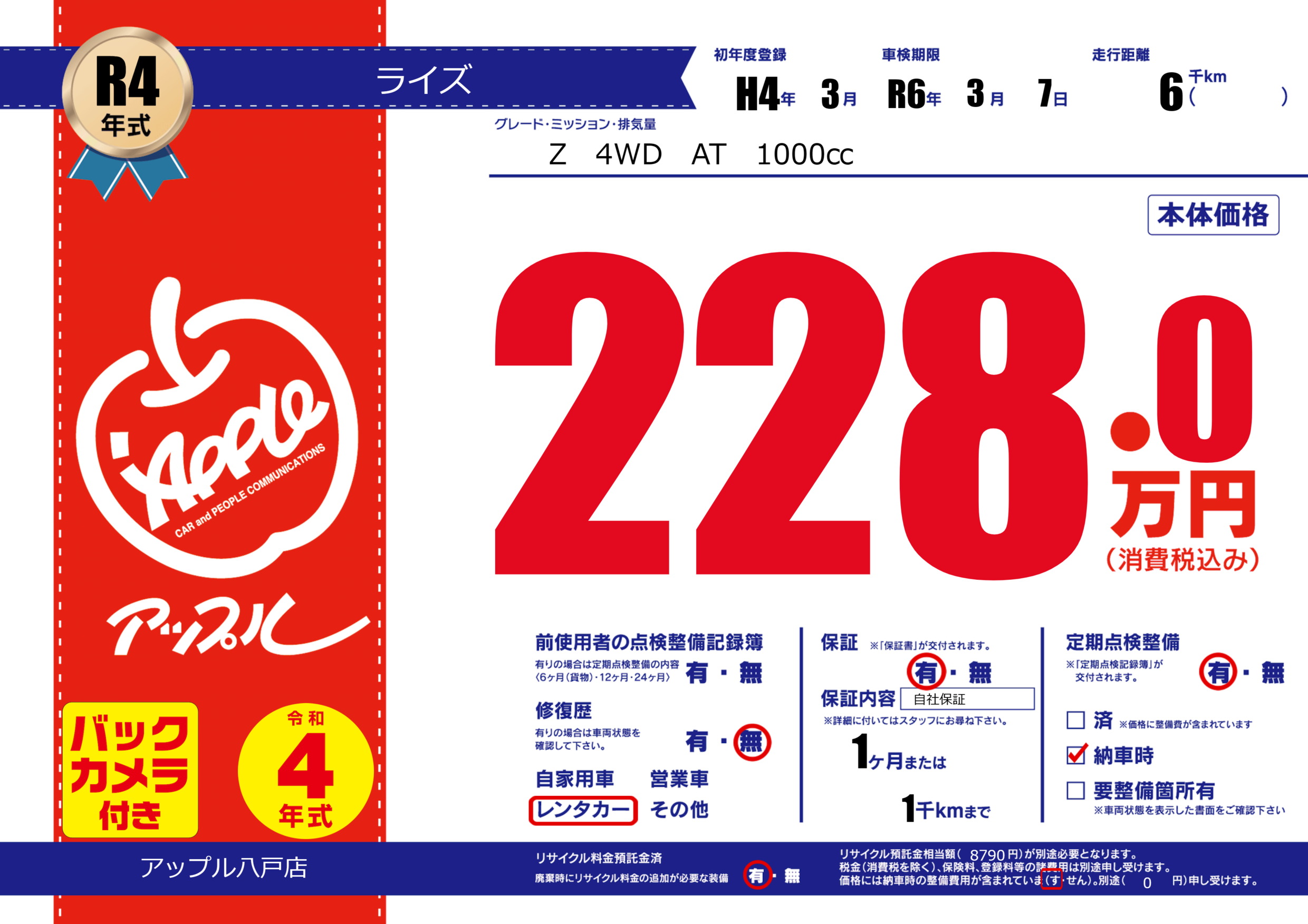 保証付き 保証内容( 自社保証) 1ヶ月または(1)千kmまで |