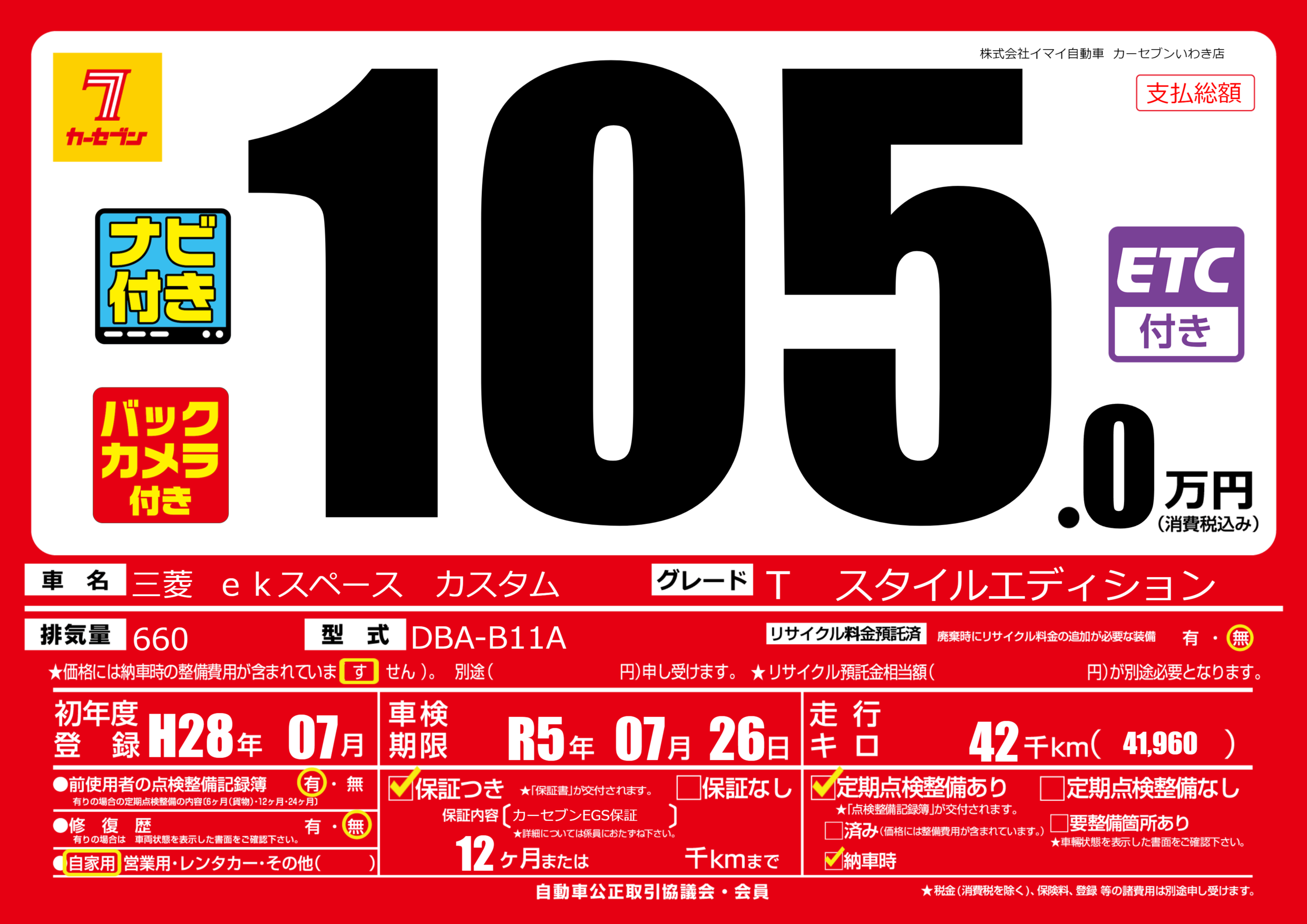 | 走行キロ | 4.2万km | 初年度登録 | H28年07月 |