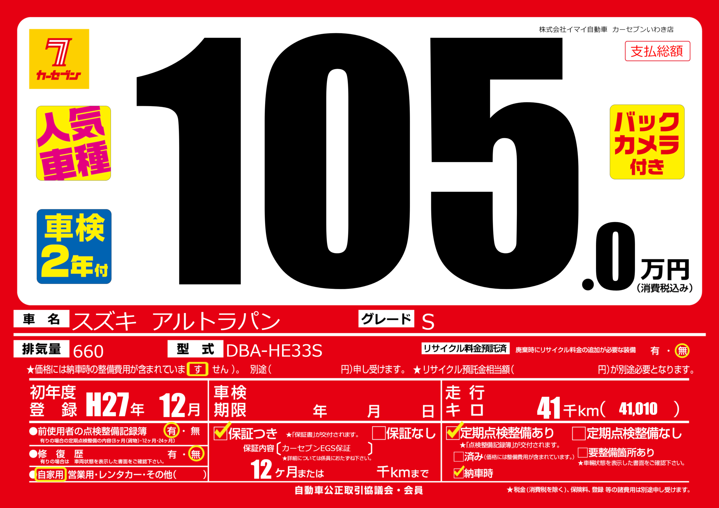 保証付き 保証内容(カーセブンEGS保証) 12ヶ月または千km |
