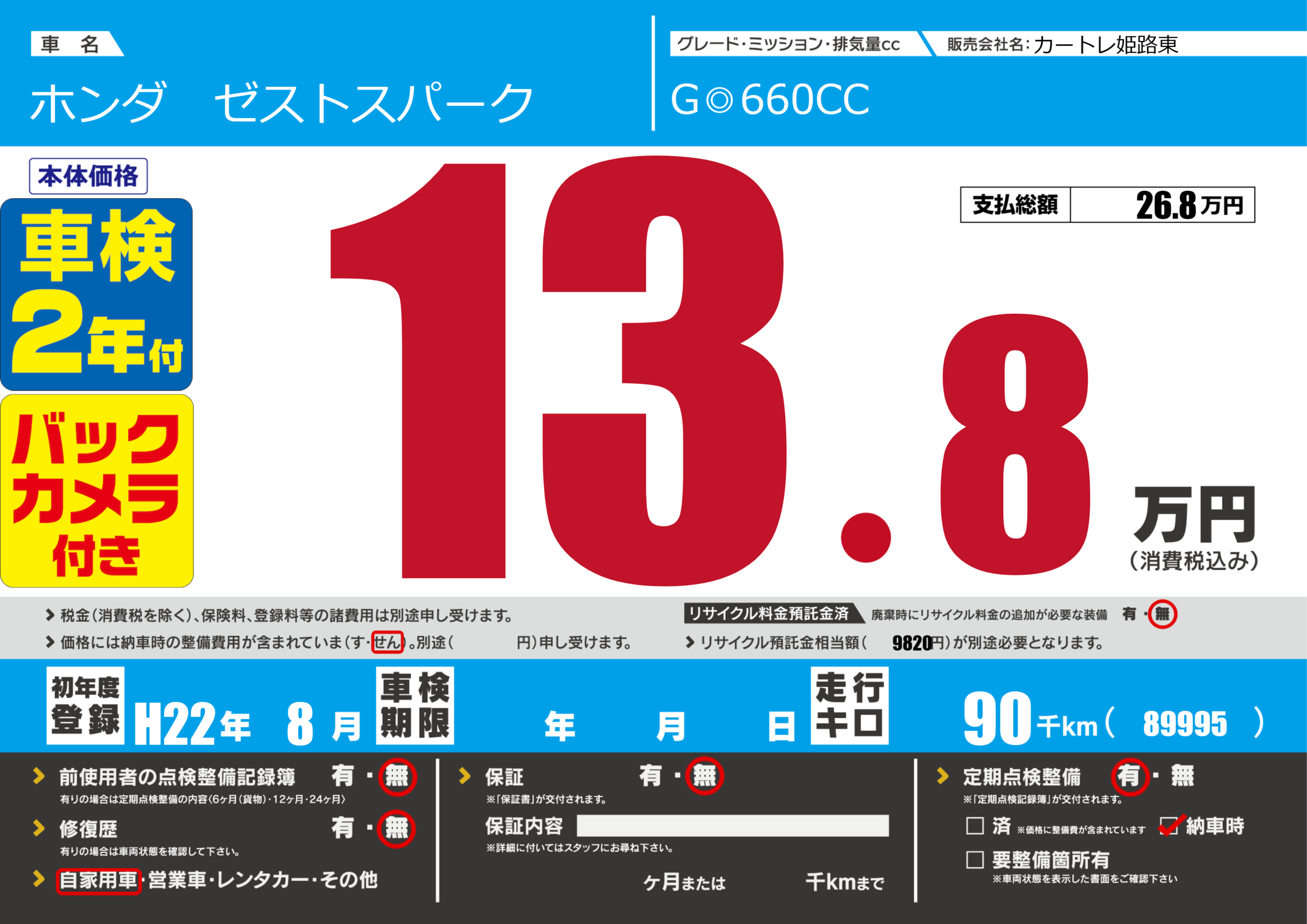 | 走行キロ | 9万km | 初年度登録 | H22年8月 |