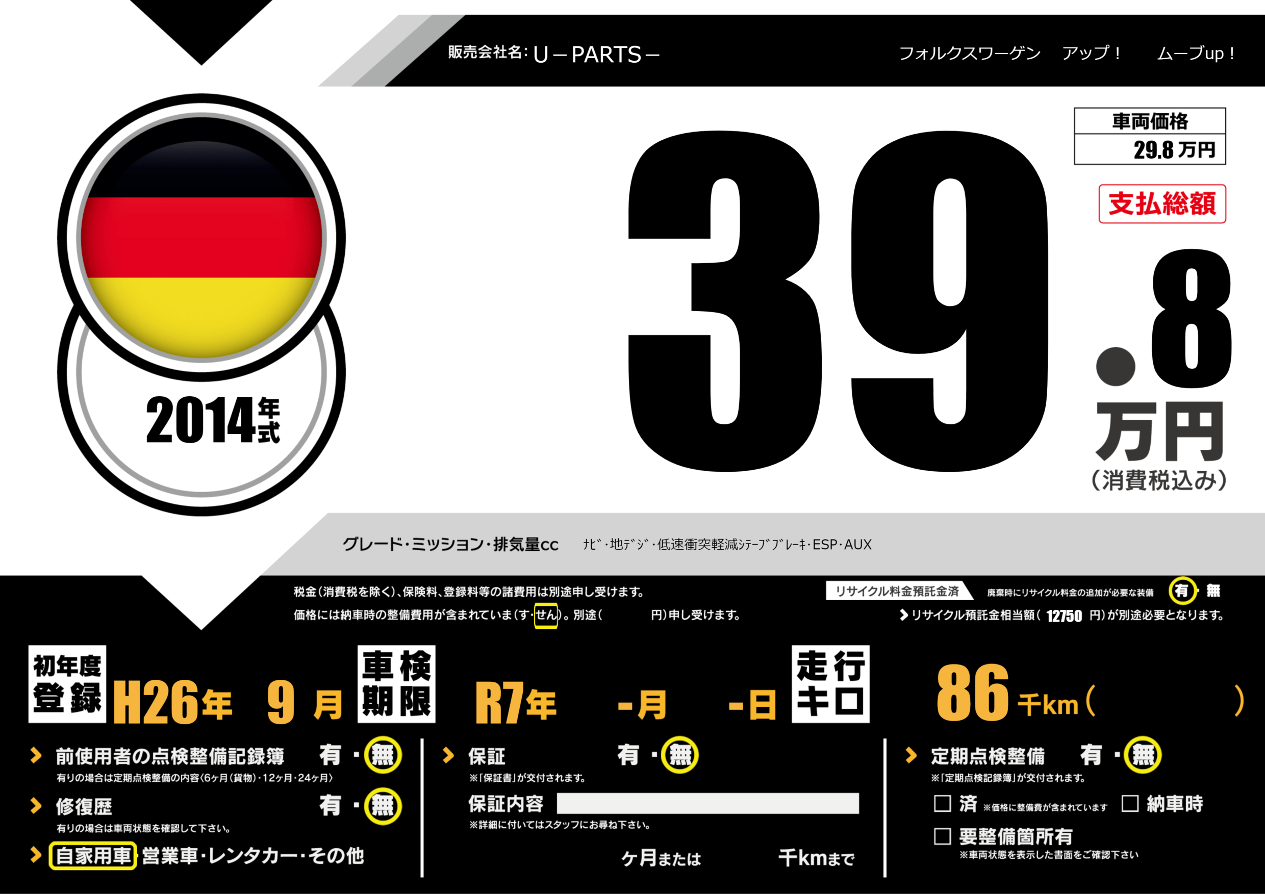 | 走行キロ | 8.6万km | 初年度登録 | H26年9月 |