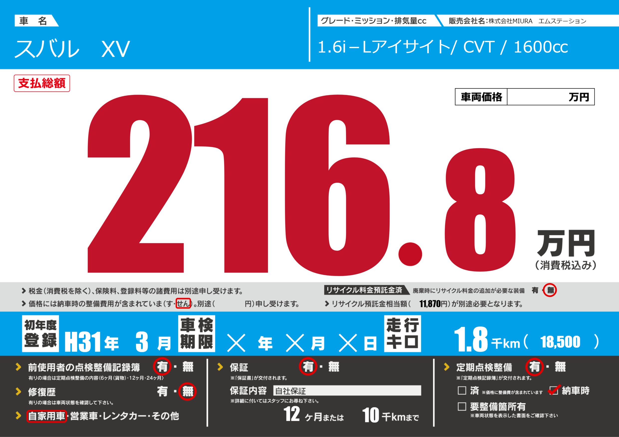 | 車検制限 | ✕年 ✕月 ✕日 | ||