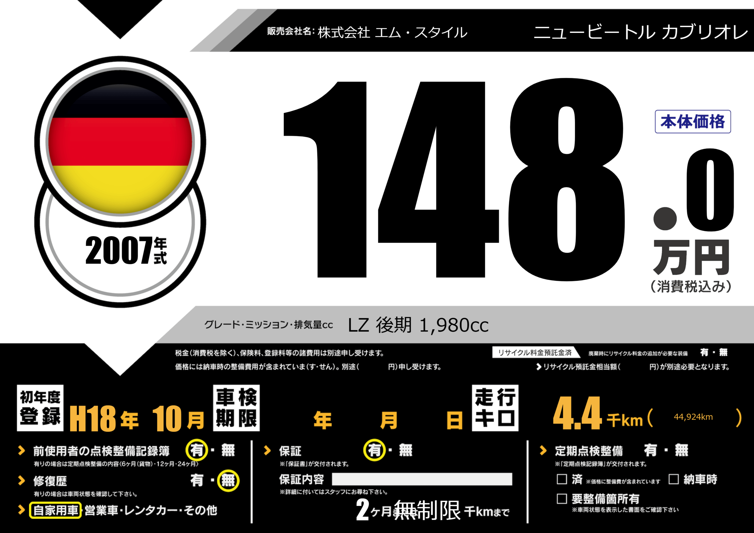 | 車名 | ニュービートル カブリオレ | グレード ミッション 排気量 |