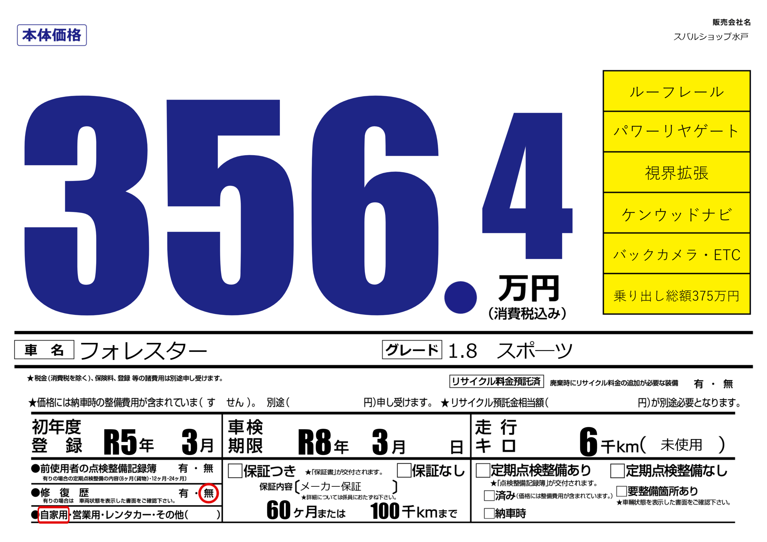 | 車名 | フォレスター | グレード ミッション 排気量 |