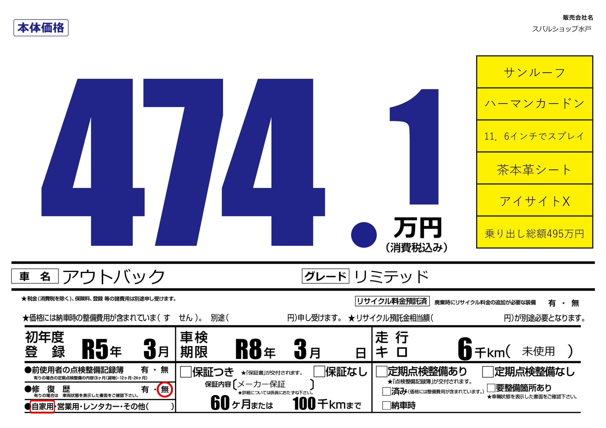 | 車名 | アウトバック | グレード ミッション 排気量 |