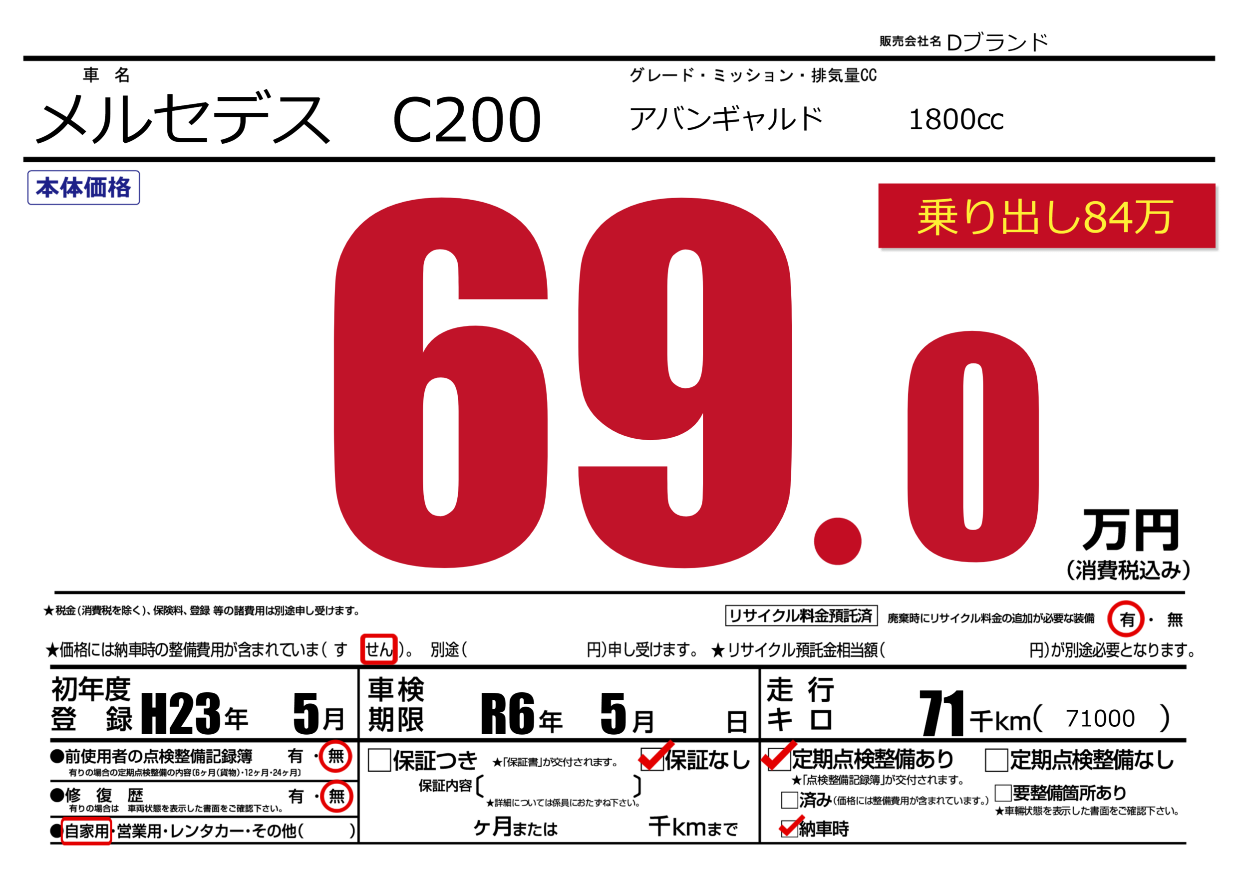 | 車名 | メルセデス C200 | グレード ミッション 排気量 |