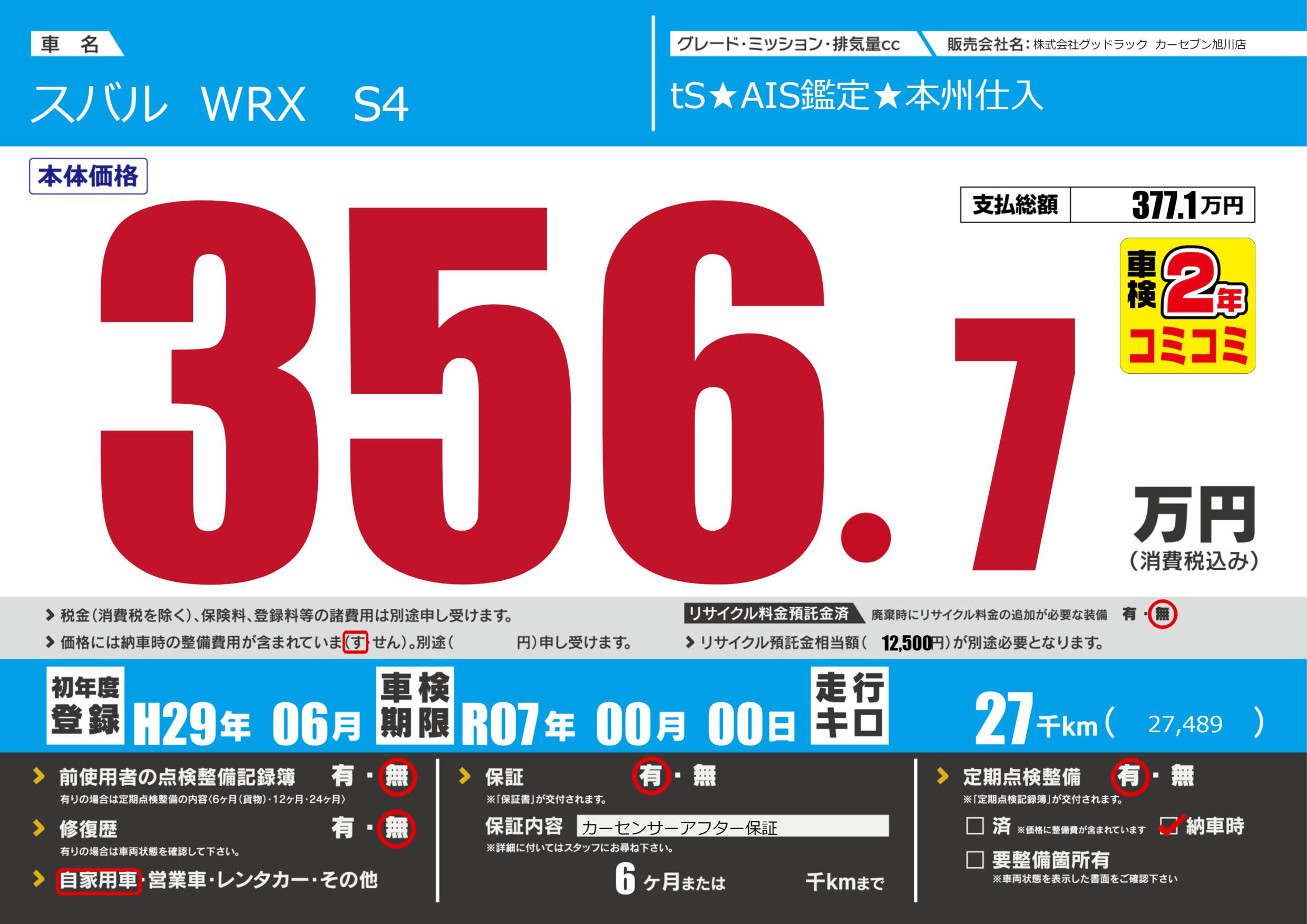 | 車名 | スバル WRX S4 | グレード ミッション 排気量 |