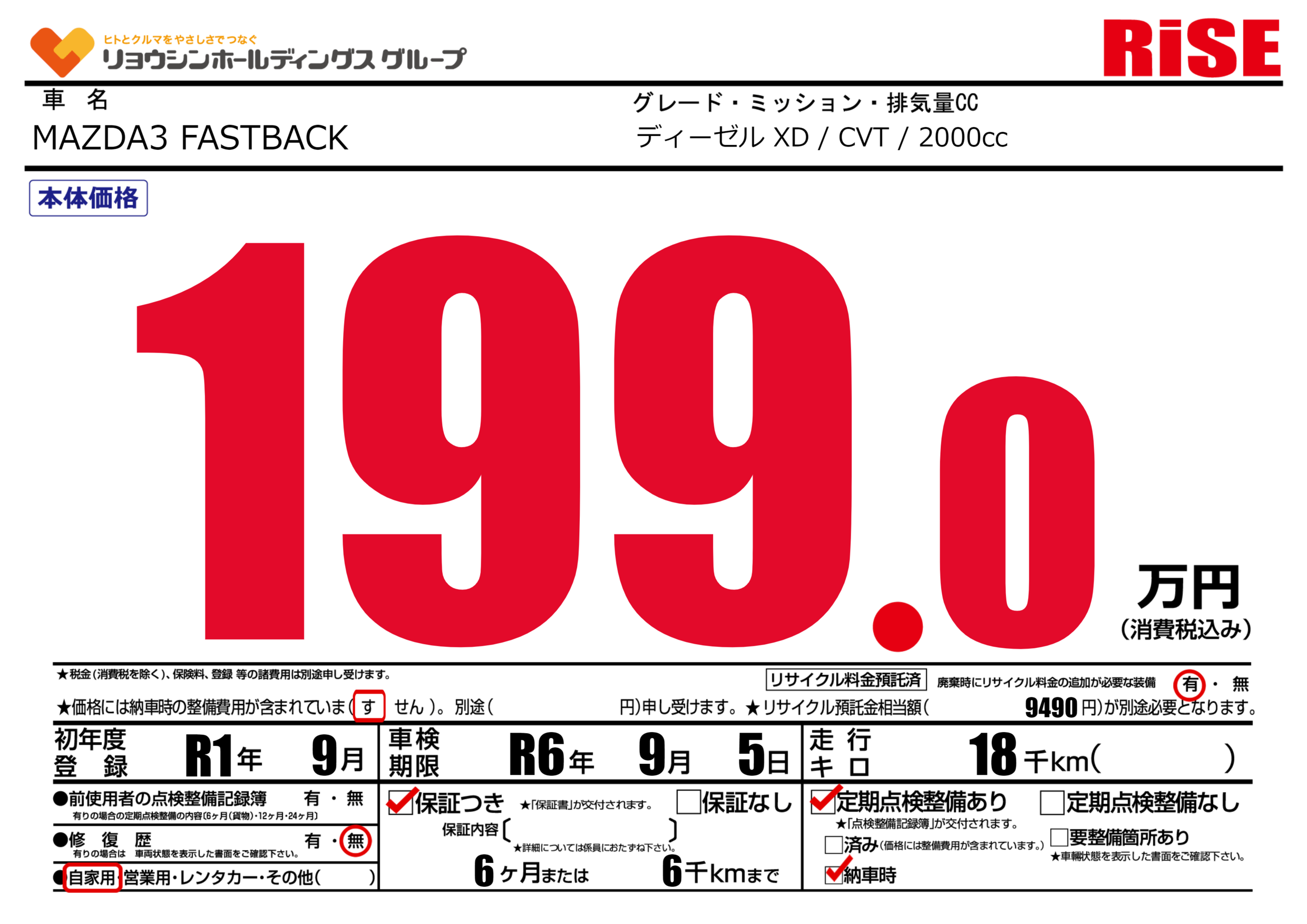 | 車名 | MAZDA3 FASTBACK | グレード ミッション 排気量 |