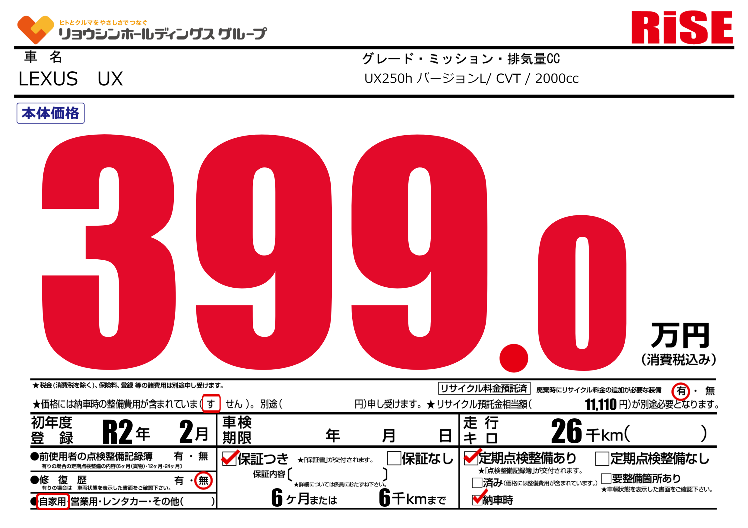 | 車名 | LEXUS UX | グレード ミッション 排気量 |
