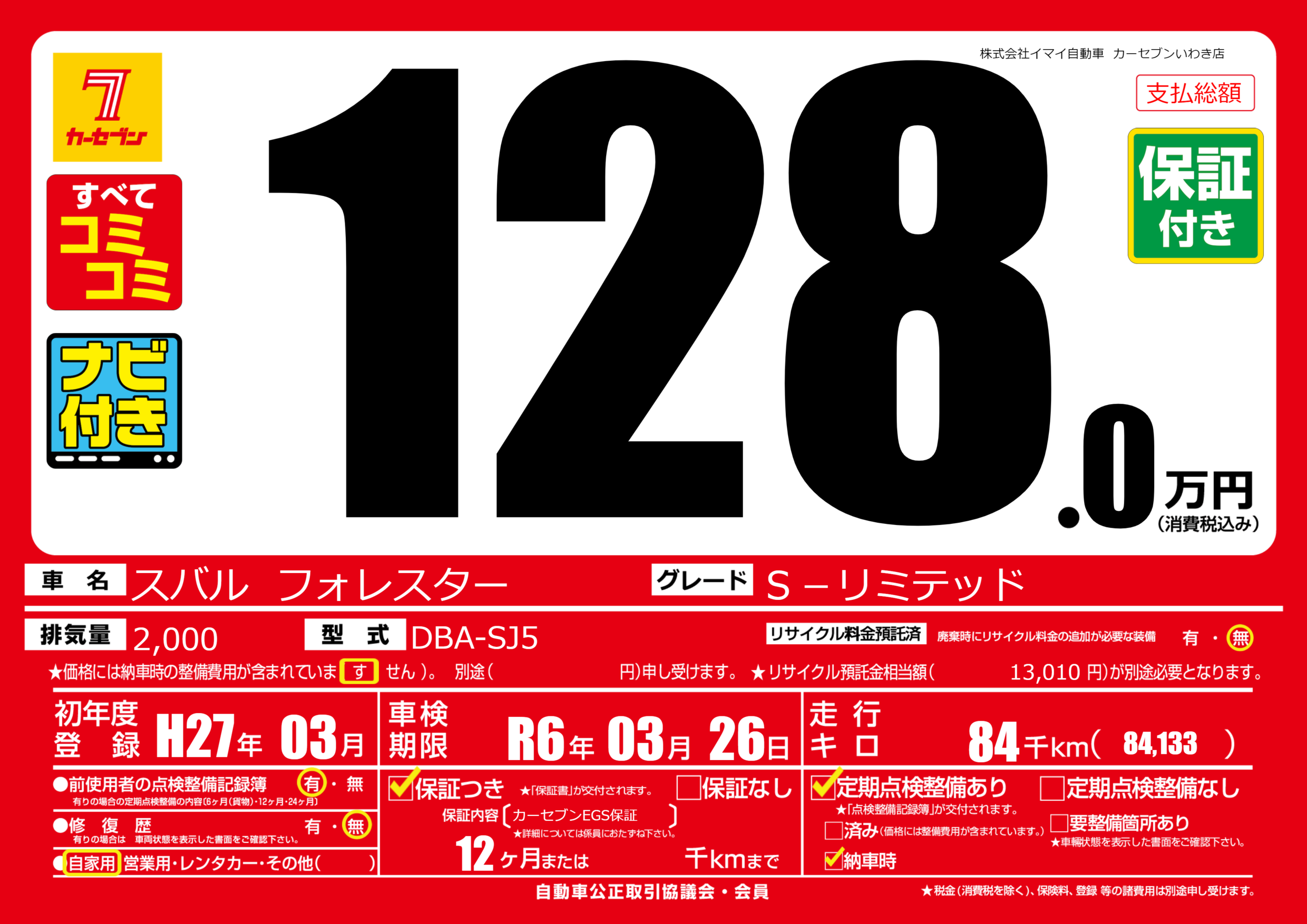 保証付き 保証内容(カーセブンEGS保証) 12ヶ月または千km |