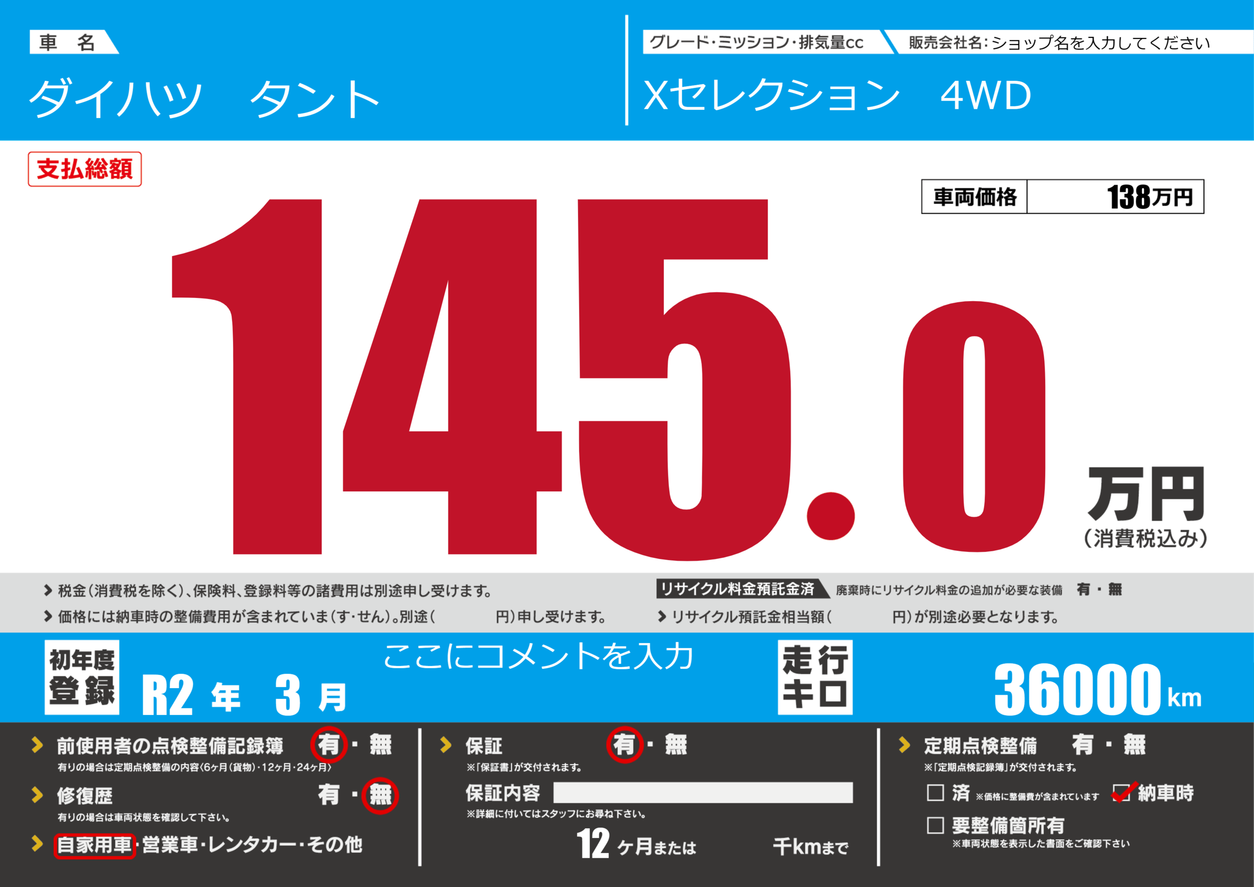 保証付き 保証内容(---) 12ヶ月または()千kmまで |