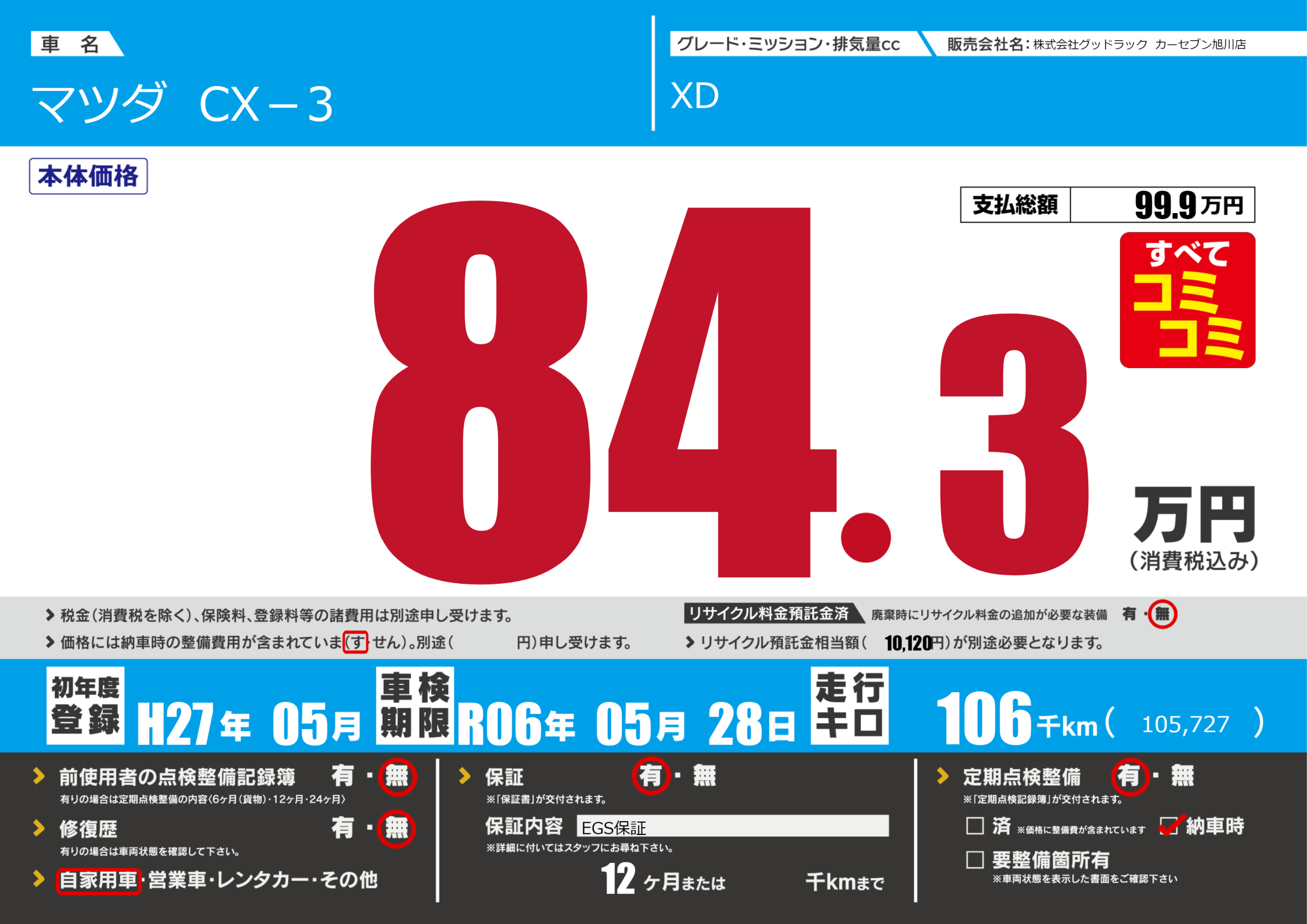 | 車名 | マツダ CX-3 | グレード ミッション 排気量 |