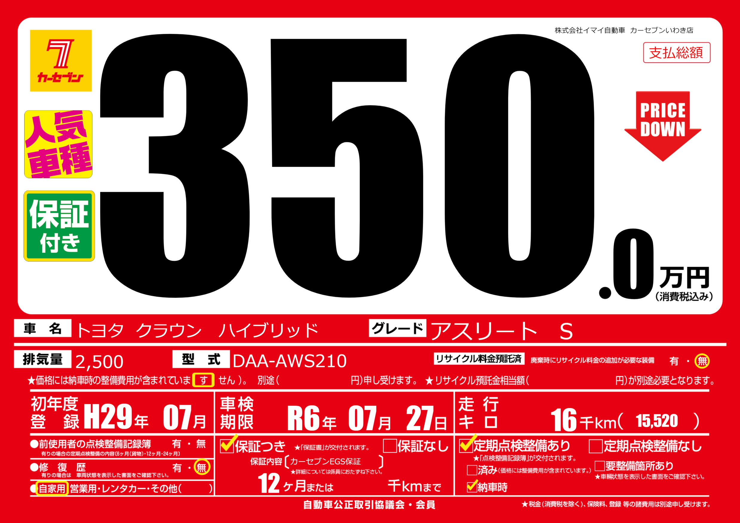 | 車検制限 | R6年 07月 27日 | ||