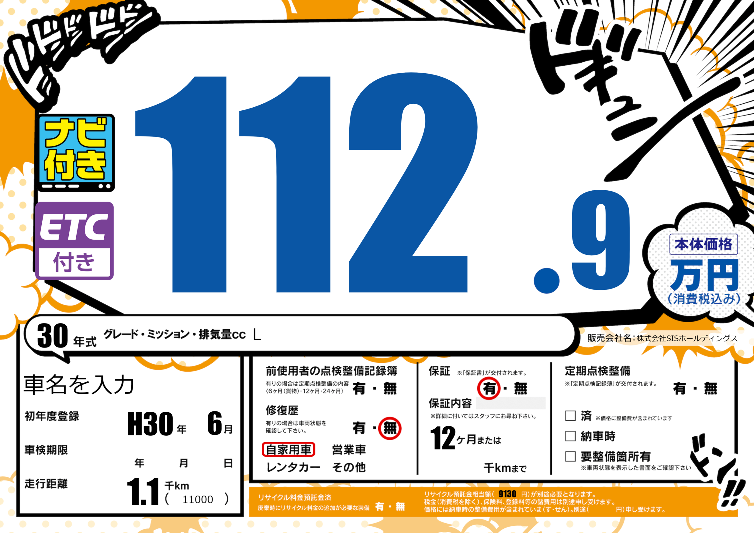 保証付き 保証内容(---) 12ヶ月または()千kmまで |