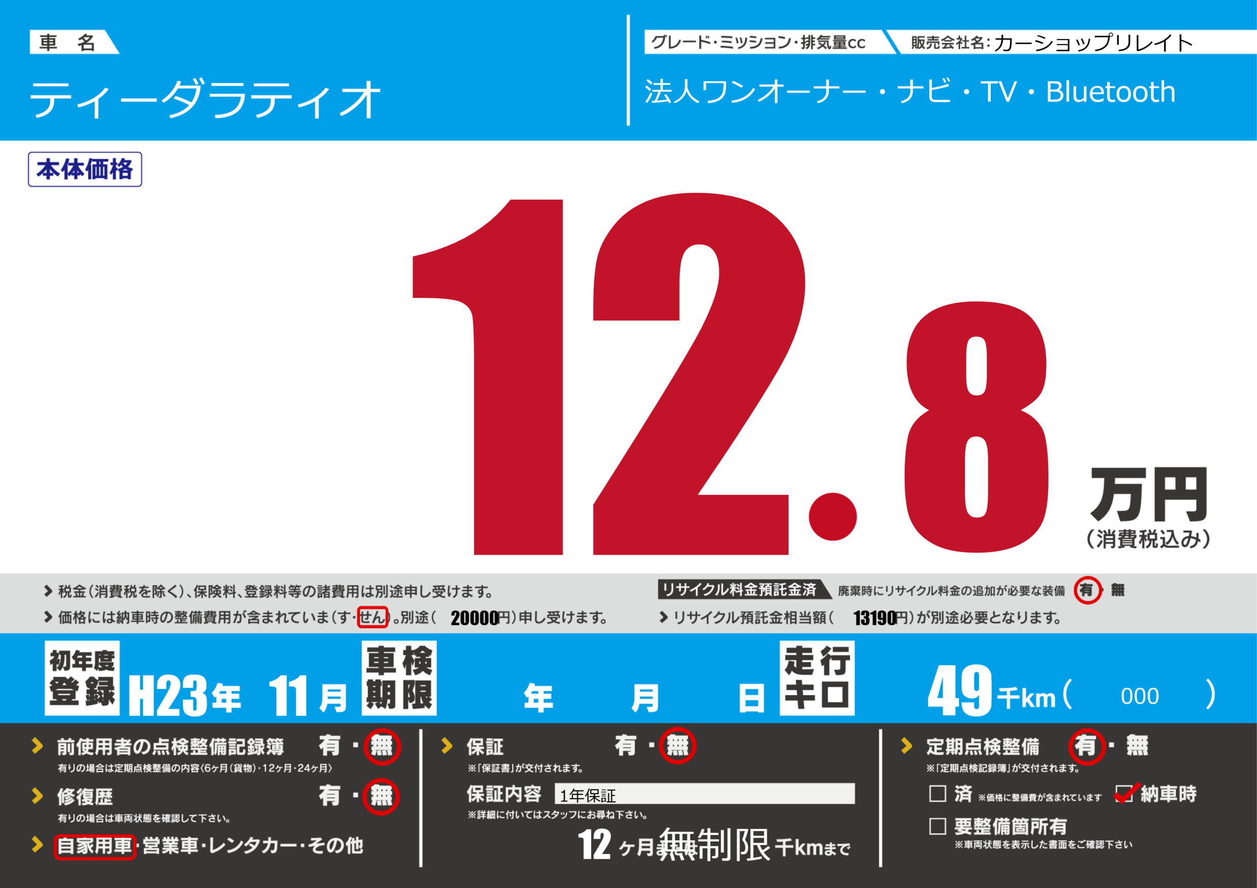 | 定期点検整備 | 定期点検整備あり 納車時あり | ||