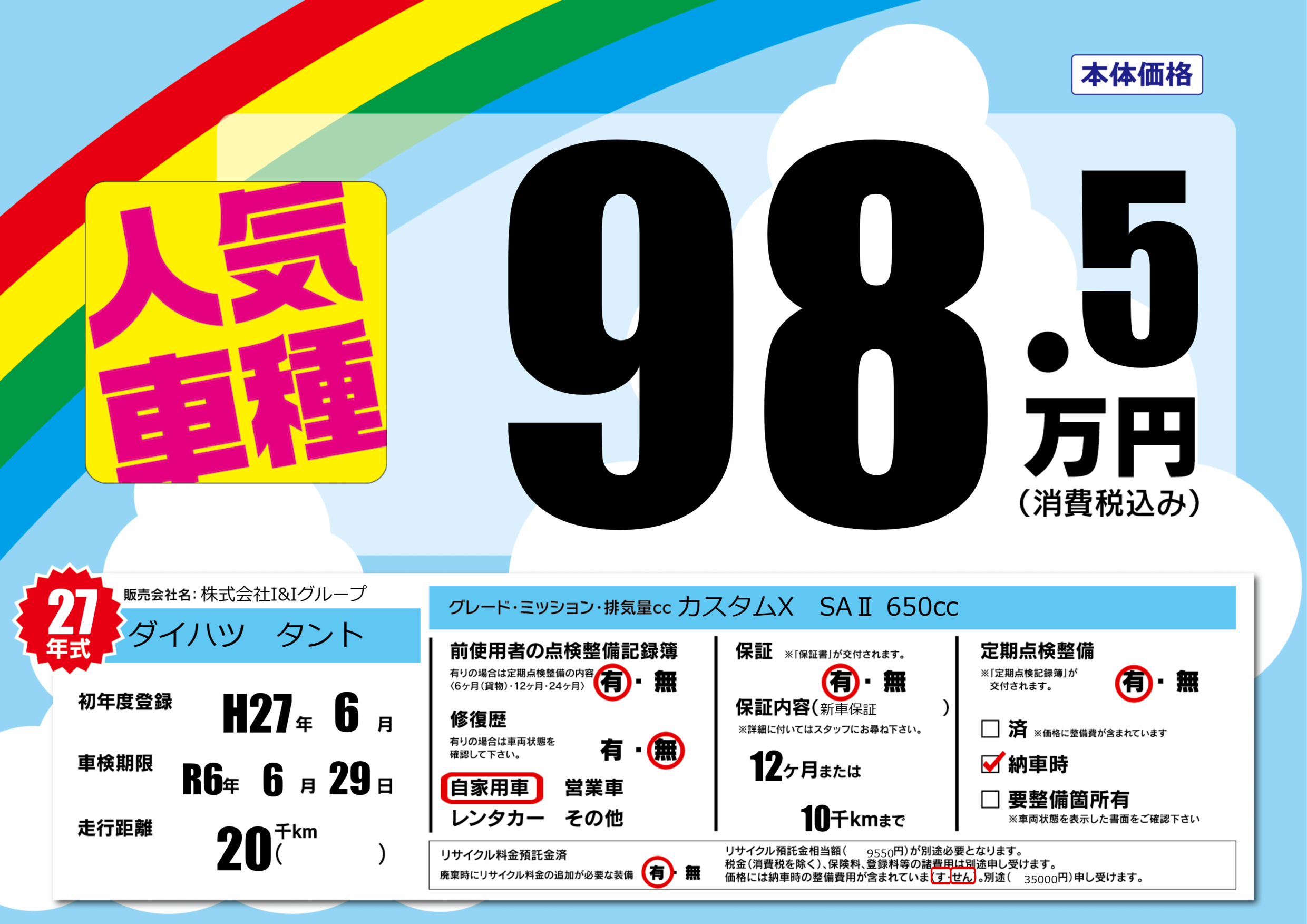 | 車名 | ダイハツ タント | グレード ミッション 排気量 |