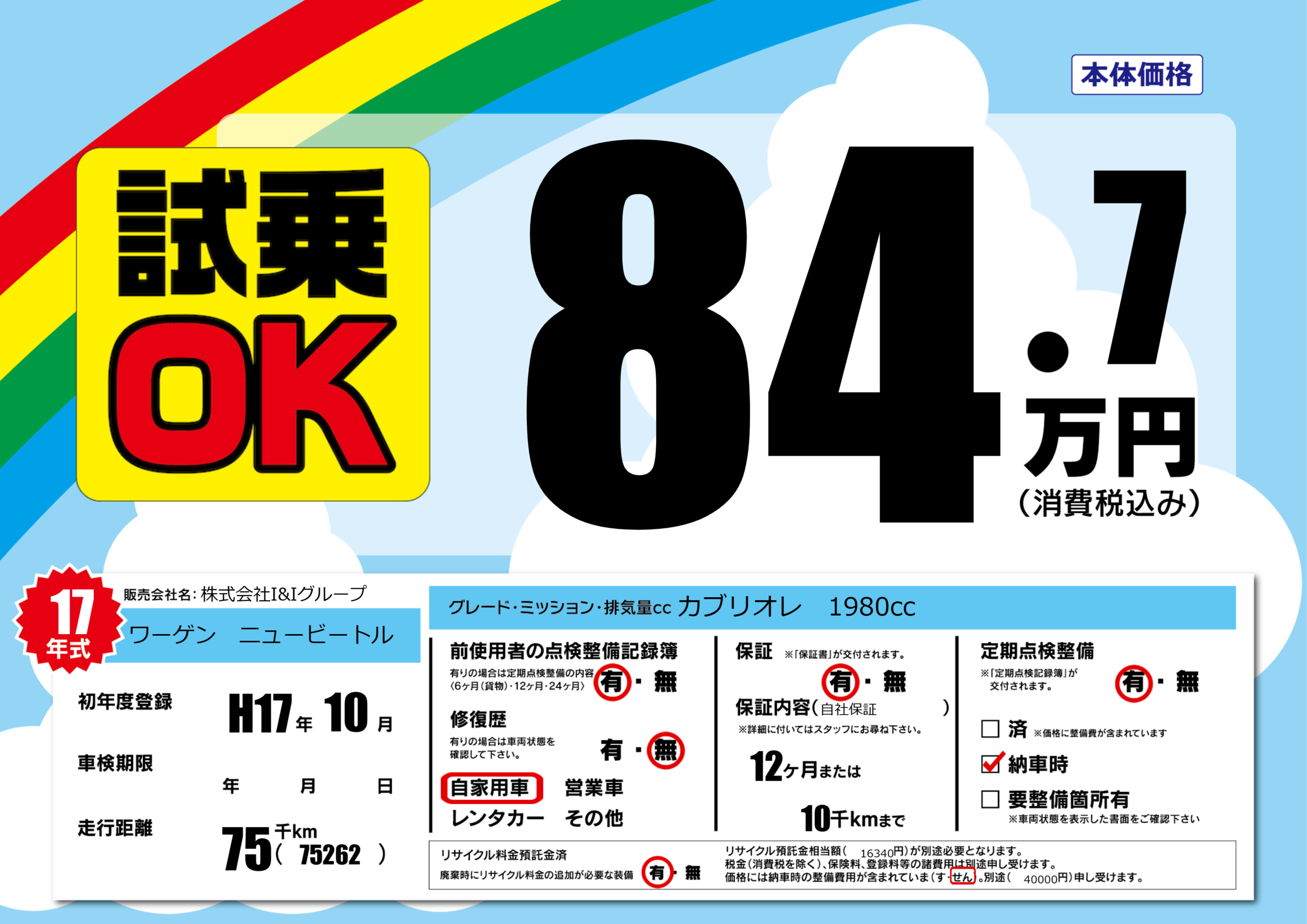 | 車名 | ワーゲン ニュービートル | グレード ミッション 排気量 |