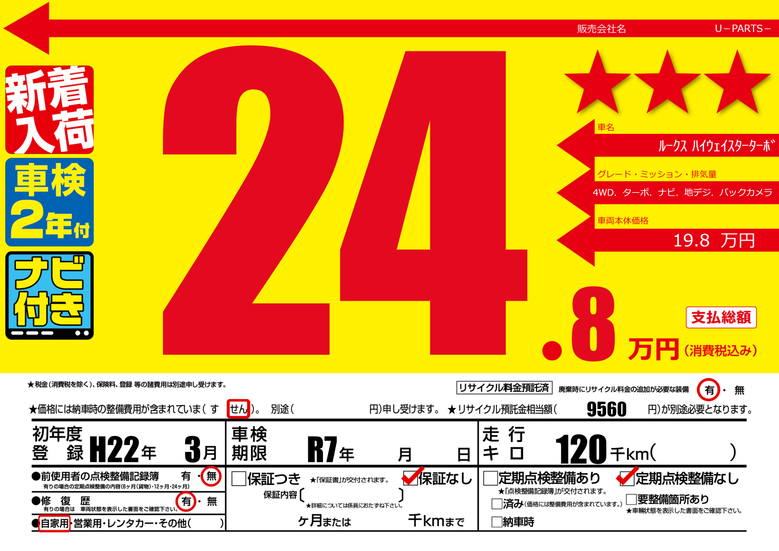 | 走行キロ | 12万km | 初年度登録 | H22年3月 |