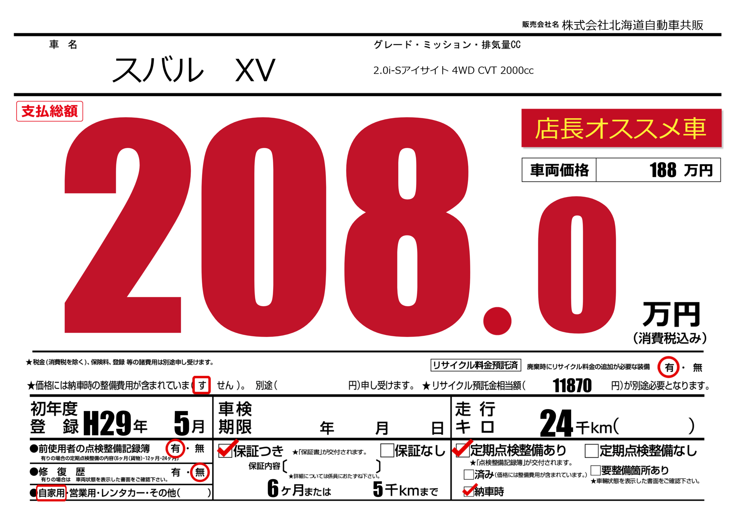 | 車名 | スバル XV | グレード ミッション 排気量 |
