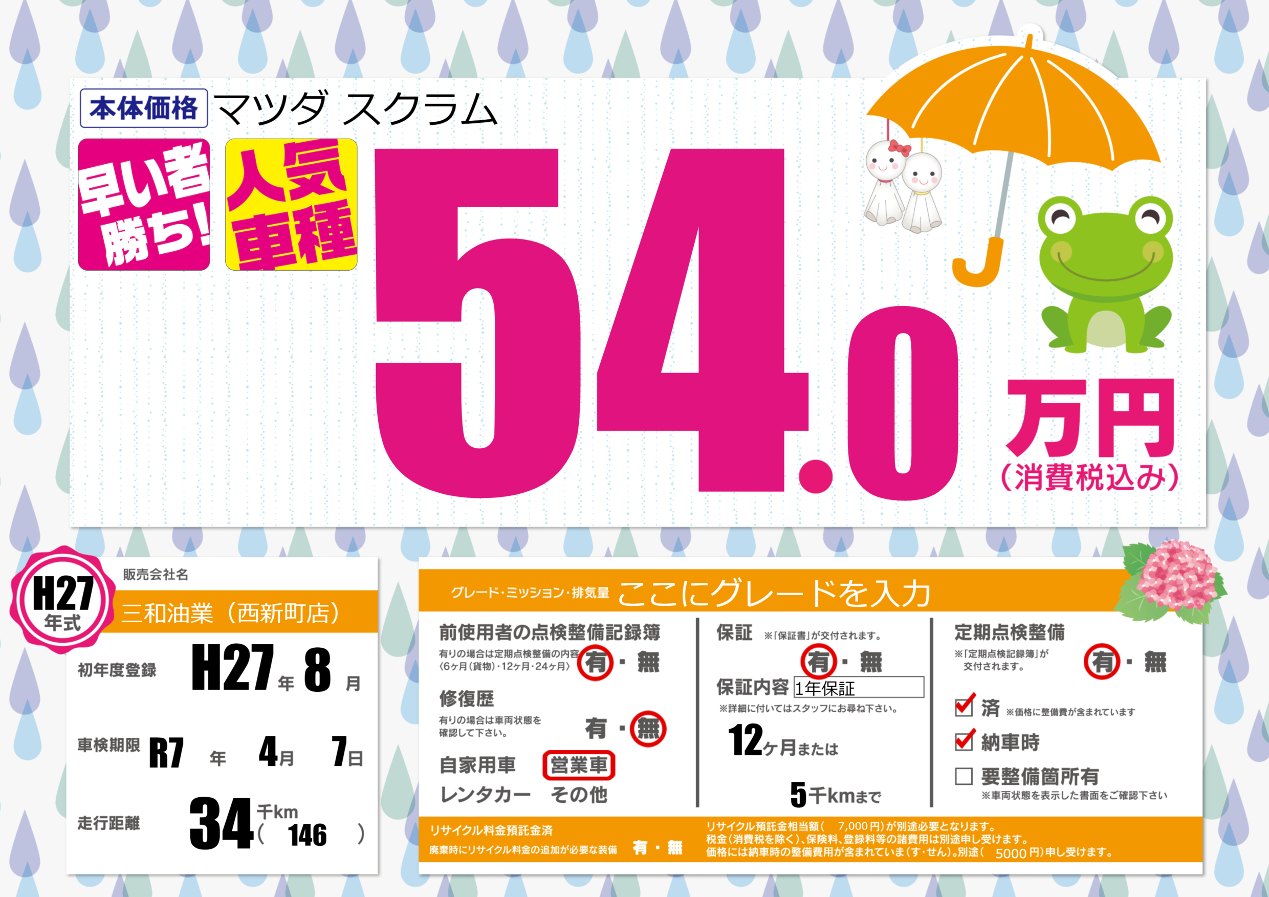 | 車名 | マツダ スクラム | グレード ミッション 排気量 |
