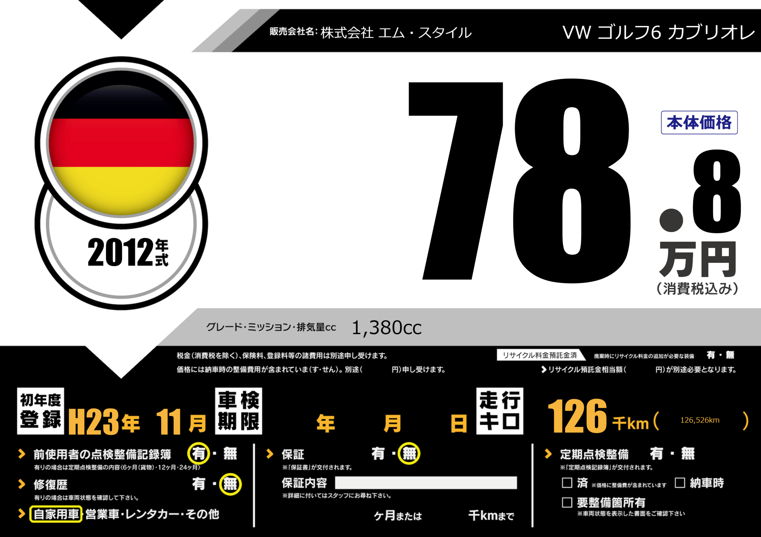 | 車名 | VW ゴルフ6 カブリオレ | グレード ミッション 排気量 |