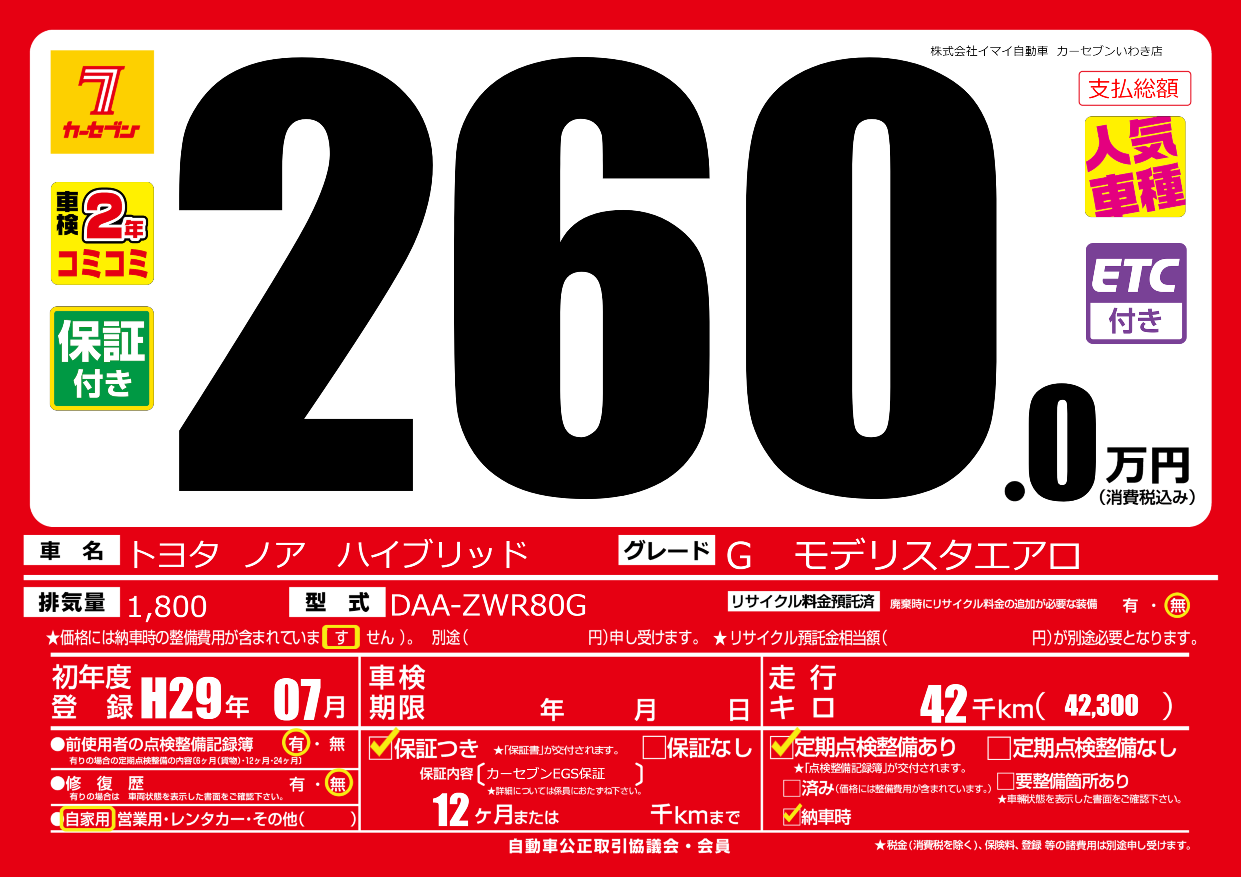 | 車名 | トヨタ ノア ハイブリッド | グレード ミッション 排気量 |