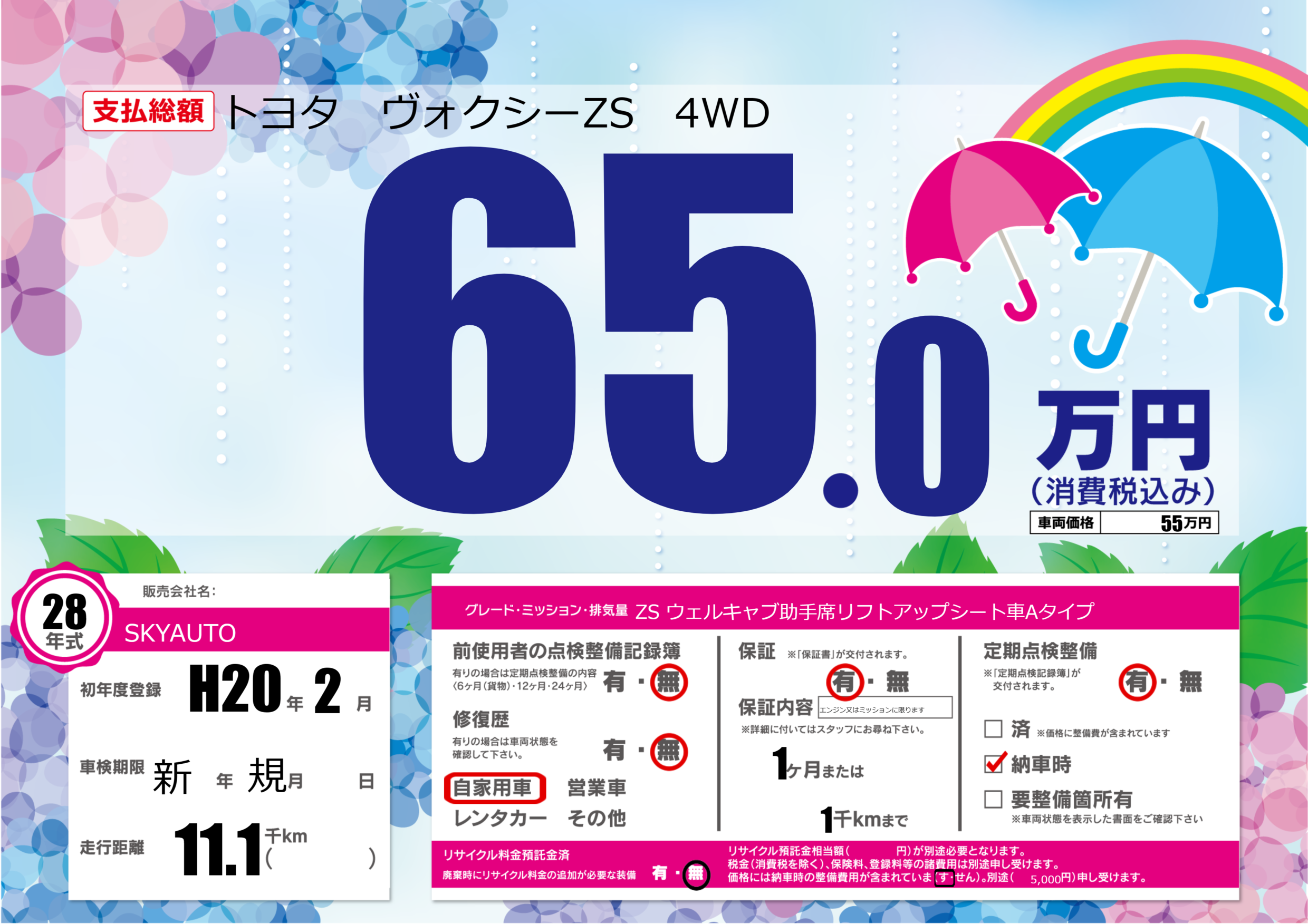 | 車名 | トヨタ ヴォクシーZS 4WD | グレード ミッション 排気量 |