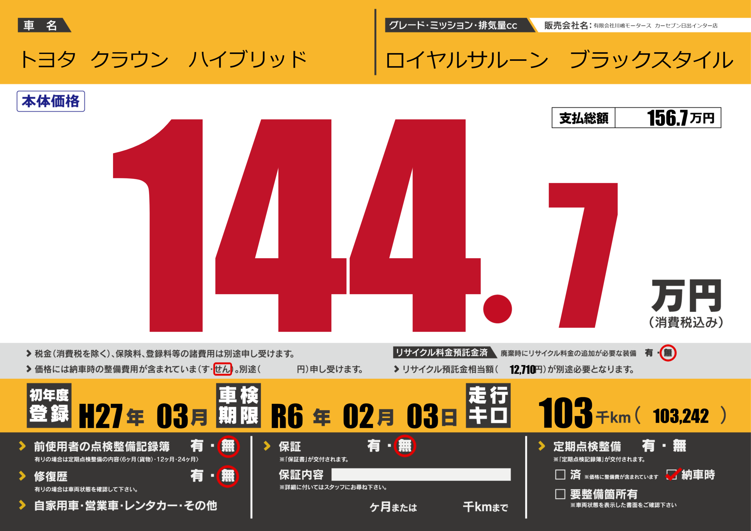 | 車検制限 | R6年 02月 03日 | ||